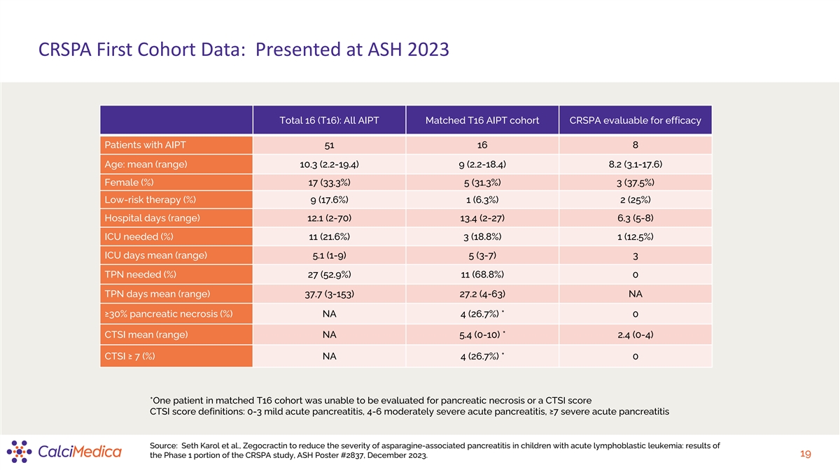 CRSPA First Cohort Data: Presented at ASH 2023 Total 16 (T16): All AIPT Matched T16 AIPT cohort CRSPA evaluable for efficacy Patients with AIPT 51 16 8 Age: mean (range) 10.3 (2.2-19.4) 9 (2.2-18.4) 8.2 (3.1-17.6) Female (%) 17 (33.3%) 5 (31.3%) 3 (37.5%) Low-risk therapy (%) 9 (17.6%) 1 (6.3%) 2 (25%) Hospital days (range) 12.1 (2-70) 13.4 (2-27) 6.3 (5-8) ICU needed (%) 11 (21.6%) 3 (18.8%) 1 (12.5%) ICU days mean (range) 5.1 (1-9) 5 (3-7) 3 TPN needed (%) 27 (52.9%) 11 (68.8%) 0 TPN days mean (range) 37.7 (3-153) 27.2 (4-63) NA ≥30% pancreatic necrosis (%) NA 4 (26.7%) * 0 CTSI mean (range) NA 5.4 (0-10) * 2.4 (0-4) CTSI ≥ 7 (%) NA 4 (26.7%) * 0 *One patient in matched T16 cohort was unable to be evaluated for pancreatic necrosis or a CTSI score CTSI score definitions: 0-3 mild acute pancreatitis, 4-6 moderately severe acute pancreatitis, ≥7 severe acute pancreatitis Source: Seth Karol et al., Zegocractin to reduce the severity of asparagine-associated pancreatitis in children with acute lymphoblastic leukemia: results of 19 the Phase 1 portion of the CRSPA study, ASH Poster #2837, December 2023.