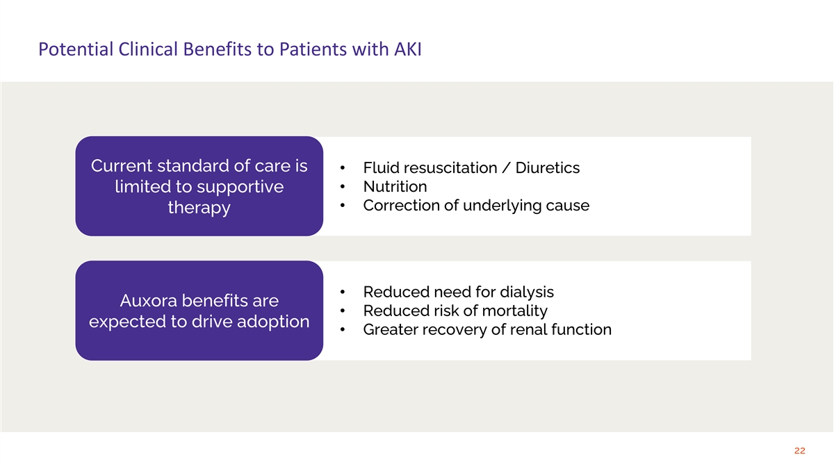 Patient Journey in AKI Disease Progression without Early Intervention Post Injury 7 Days 90 Days Acute Chronic End-stage AKI Kidney Disease Kidney Disease Renal Disease ~3.7M AKI hospitalizations annually (U.S.) 71% 17% 12% Stage 2 Stage 1 Stage 3 2 ↑ sCr 2x ↑ sCr 1.5x↑ sCr 3x 1 Auxora Target Market: 1.1M Patients Over half of these patients have respiratory failure with 90-day mortality 50% or greater 1) Source: https://www.hcup-us.ahrq.gov/reports/statbriefs/sb231-Acute-Renal-Failure-Hospitalizations.pdf 21 Criteria: Based on RIFLE staging criteria for AKI classification; Serum creatinine increase over baseline 2) sCr: Serum Creatinine