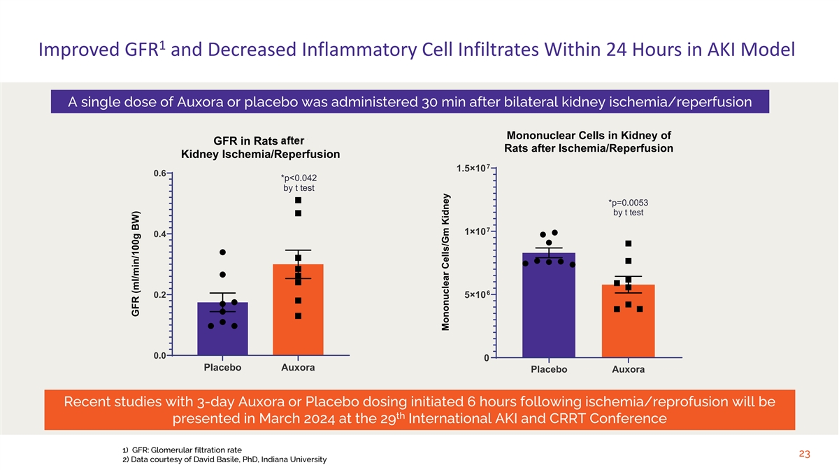 1 Improved GFR and Decreased Inflammatory Cell Infiltrates Within 24 Hours in AKI Model A single dose of Auxora or placebo was administered 30 min after bilateral kidney ischemia/reperfusion Mononuclear Cells in Kidney of GFR in Rats After Rats after Ischemia/Reperfusion Kidney Ischemia/Reperfusion 7 1.5×10 0.6 *p<0.042 by t test *p=0.0053 by t test 7 1×10 0.4 6 0.2 5×10 0.0 0 Placebo Auxora Placebo Auxora Recent studies with 3-day Auxora or Placebo dosing initiated 6 hours following ischemia/reprofusion will be th presented in March 2024 at the 29 International AKI and CRRT Conference 1) GFR: Glomerular filtration rate 23 2) Data courtesy of David Basile, PhD, Indiana University GFR (ml/min/100g BW) Mononuclear Cells/Gm Kidney