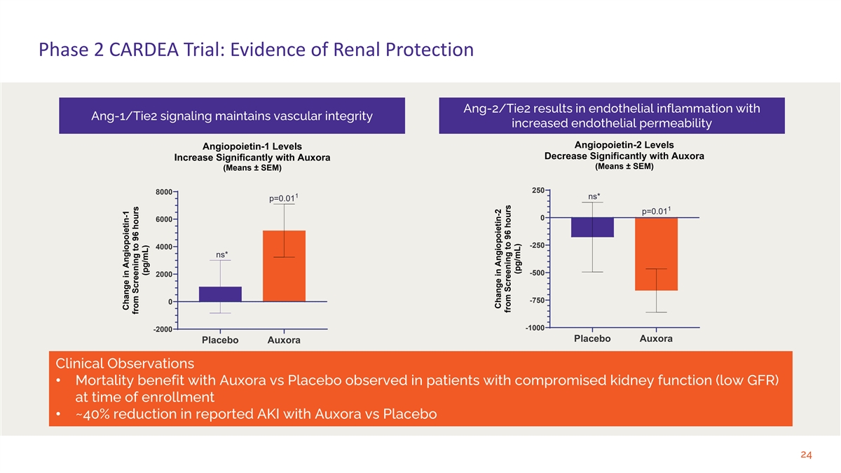 Phase 2 CARDEA Trial: Evidence of Renal Protection Ang-2/Tie2 results in endothelial inflammation with Ang-1/Tie2 signaling maintains vascular integrity increased endothelial permeability Angiopoietin-2 Levels Angiopoietin-1 Levels Decrease Significantly with Auxora Increase Significantly with Auxora (Means ± SEM) (Means ± SEM) 250 8000 1 ns* p=0.01 1 p=0.01 0 6000 -250 4000 ns* -500 2000 -750 0 -1000 -2000 Placebo Auxora Placebo Auxora Clinical Observations • Mortality benefit with Auxora vs Placebo observed in patients with compromised kidney function (low GFR) at time of enrollment • ~40% reduction in reported AKI with Auxora vs Placebo 24 Change in Angiopoietin-1 from Screening to 96 hours (pg/mL) Change in Angiopoietin-2 from Screening to 96 hours (pg/mL)