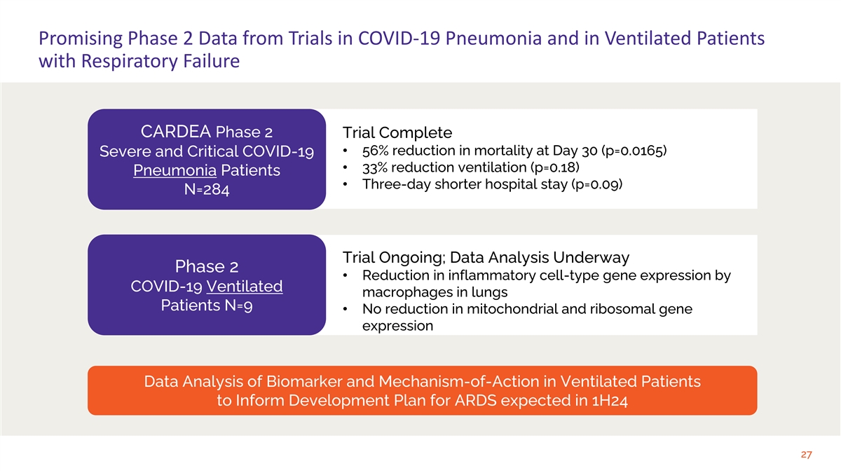 Promising Phase 2 Data from Trials in COVID-19 Pneumonia and in Ventilated Patients with Respiratory Failure CARDEA Phase 2 Trial Complete • 56% reduction in mortality at Day 30 (p=0.0165) Severe and Critical COVID-19 • 33% reduction ventilation (p=0.18) Pneumonia Patients • Three-day shorter hospital stay (p=0.09) N=284 Trial Ongoing; Data Analysis Underway Phase 2 • Reduction in inflammatory cell-type gene expression by COVID-19 Ventilated macrophages in lungs Patients N=9 • No reduction in mitochondrial and ribosomal gene expression Data Analysis of Biomarker and Mechanism-of-Action in Ventilated Patients to Inform Development Plan for ARDS expected in 1H24 27