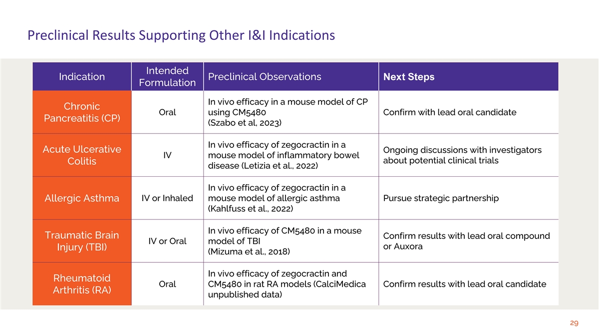 Preclinical Results Supporting Other I&I Indications Intended Indication Preclinical Observations Next Steps Formulation In vivo efficacy in a mouse model of CP Chronic Oral using CM5480 Confirm with lead oral candidate Pancreatitis (CP) (Szabo et al, 2023) In vivo efficacy of zegocractin in a Acute Ulcerative Ongoing discussions with investigators IV mouse model of inflammatory bowel about potential clinical trials Colitis disease (Letizia et al., 2022) In vivo efficacy of zegocractin in a IV or Inhaled mouse model of allergic asthma Pursue strategic partnership Allergic Asthma (Kahlfuss et al., 2022) In vivo efficacy of CM5480 in a mouse Traumatic Brain Confirm results with lead oral compound IV or Oral model of TBI or Auxora Injury (TBI) (Mizuma et al., 2018) In vivo efficacy of zegocractin and Rheumatoid Oral CM5480 in rat RA models (CalciMedica Confirm results with lead oral candidate Arthritis (RA) unpublished data) 29