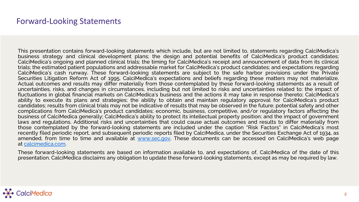 Forward-Looking Statements This presentation contains forward-looking statements which include, but are not limited to, statements regarding CalciMedica’s business strategy and clinical development plans; the design and potential benefits of CalciMedica’s product candidates; CalciMedica’s ongoing and planned clinical trials; the timing for CalciMedica’s receipt and announcement of data from its clinical trials; the estimated patient populations and addressable market for CalciMedica’s product candidates; and expectations regarding CalciMedica’s cash runway. These forward-looking statements are subject to the safe harbor provisions under the Private Securities Litigation Reform Act of 1995. CalciMedica’s expectations and beliefs regarding these matters may not materialize. Actual outcomes and results may differ materially from those contemplated by these forward-looking statements as a result of uncertainties, risks, and changes in circumstances, including but not limited to risks and uncertainties related to: the impact of fluctuations in global financial markets on CalciMedica’s business and the actions it may take in response thereto; CalciMedica’s ability to execute its plans and strategies; the ability to obtain and maintain regulatory approval for CalciMedica’s product candidates; results from clinical trials may not be indicative of results that may be observed in the future; potential safety and other complications from CalciMedica’s product candidates; economic, business, competitive, and/or regulatory factors affecting the business of CalciMedica generally; CalciMedica’s ability to protect its intellectual property position; and the impact of government laws and regulations. Additional risks and uncertainties that could cause actual outcomes and results to differ materially from those contemplated by the forward-looking statements are included under the caption “Risk Factors” in CalciMedica’s most recently filed periodic report, and subsequent periodic reports filed by CalciMedica, under the Securities Exchange Act of 1934, as amended, from time to time and available at www.sec.gov. These documents can be accessed on CalciMedica’s web page at calcimedica.com. These forward-looking statements are based on information available to, and expectations of, CalciMedica of the date of this presentation. CalciMedica disclaims any obligation to update these forward-looking statements, except as may be required by law. 2