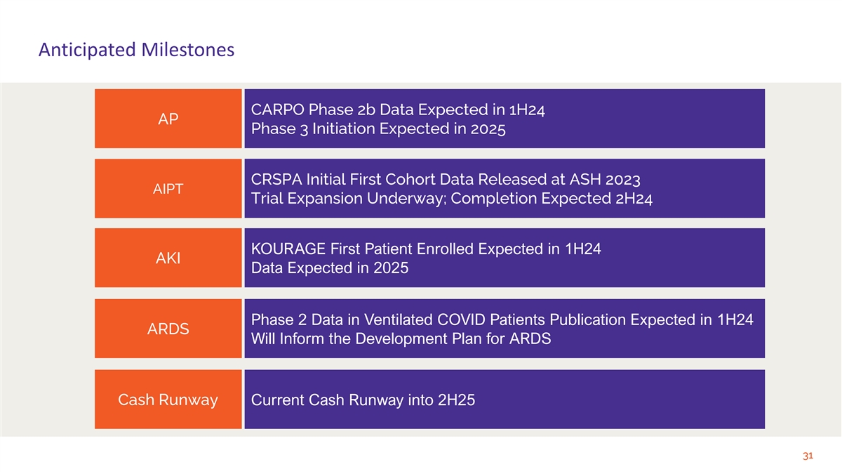Anticipated Milestones CARPO Phase 2b Data Expected in 1H24 AP Phase 3 Initiation Expected in 2025 CRSPA Initial First Cohort Data Released at ASH 2023 AIPT Trial Expansion Underway; Completion Expected 2H24 KOURAGE First Patient Enrolled Expected in 1H24 AKI Data Expected in 2025 Phase 2 Data in Ventilated COVID Patients Publication Expected in 1H24 ARDS Will Inform the Development Plan for ARDS Cash Runway Current Cash Runway into 2H25 31