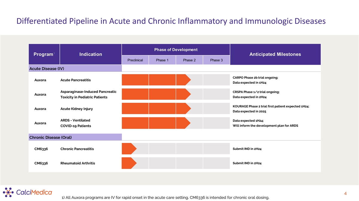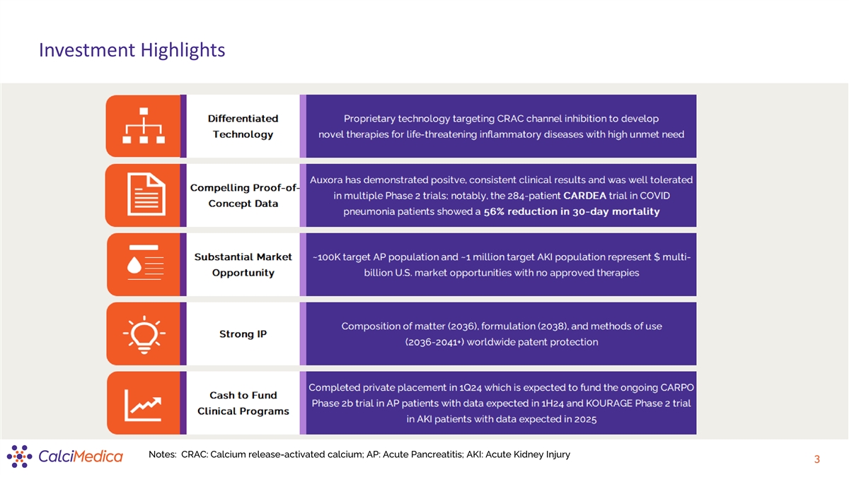 Investment Highlights Notes: CRAC: Calcium release-activated calcium; AP: Acute Pancreatitis; AKI: Acute Kidney Injury 3