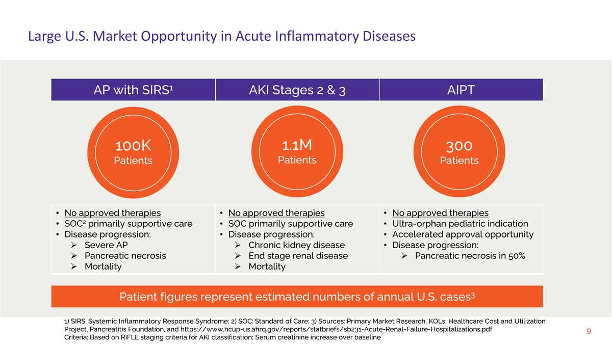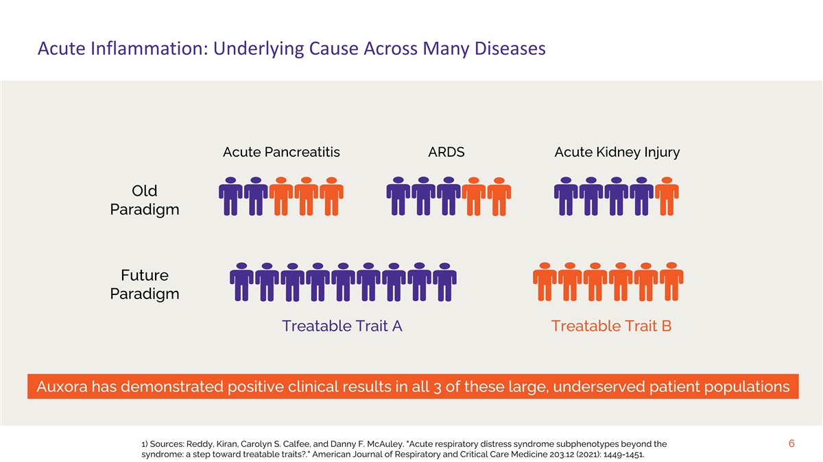 Acute Inflammation: Underlying Cause Across Many Diseases Acute Pancreatitis ARDS Acute Kidney Injury Old Paradigm Future Paradigm Treatable Trait A Treatable Trait B Auxora has demonstrated positive clinical results in all 3 of these large, underserved patient populations 1) Sources: Reddy, Kiran, Carolyn S. Calfee, and Danny F. McAuley. Acute respiratory distress syndrome subphenotypes beyond the 6 syndrome: a step toward treatable traits?. American Journal of Respiratory and Critical Care Medicine 203.12 (2021): 1449-1451.