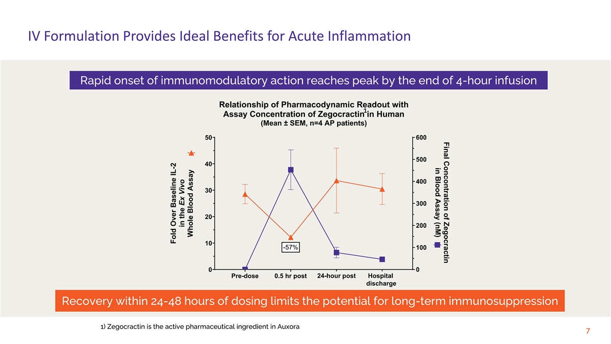 Final Concontration of Zegocractin in Blood Assay (nM) IV Formulation Provides Ideal Benefits for Acute Inflammation Rapid onset of immunomodulatory action reaches peak by the end of 4-hour infusion Relationship of Pharmacodynamic Readout with 1 Assay Concentration of Zegocractin in Human (Mean ± SEM, n=4 AP patients) 600 50 500 40 400 30 300 20 200 10 -57% 100 0 0 24-hour post Hospital Pre-dose 0.5 hr post Day 2 Discharge discharge Recovery within 24-48 hours of dosing limits the potential for long-term immunosuppression 1) Zegocractin is the active pharmaceutical ingredient in Auxora 7 Fold Over Baseline IL-2 in the Ex Vivo Whole Blood Assay