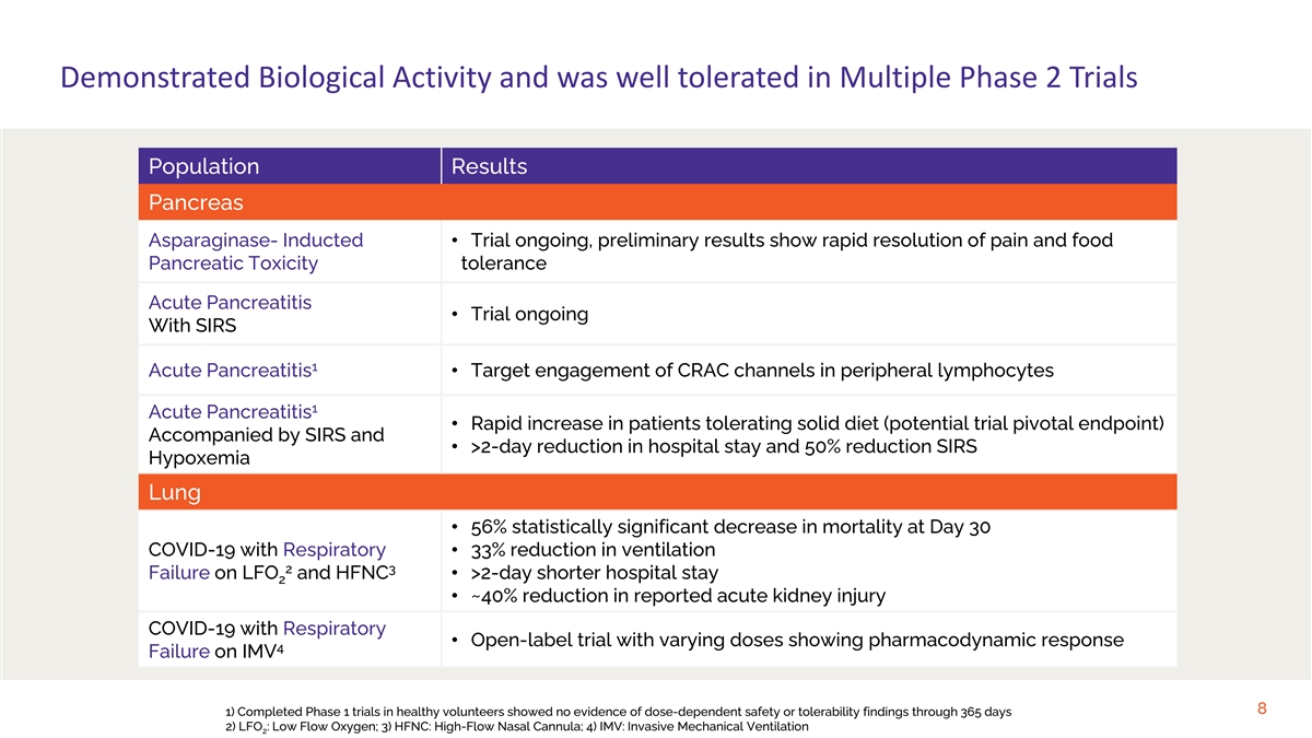 Demonstrated Biological Activity and was well tolerated in Multiple Phase 2 Trials Population Results Pancreas Asparaginase- Inducted • Trial ongoing, preliminary results show rapid resolution of pain and food Pancreatic Toxicity tolerance Acute Pancreatitis • Trial ongoing With SIRS 1 Acute Pancreatitis • Target engagement of CRAC channels in peripheral lymphocytes 1 Acute Pancreatitis • Rapid increase in patients tolerating solid diet (potential trial pivotal endpoint) Accompanied by SIRS and • >2-day reduction in hospital stay and 50% reduction SIRS Hypoxemia Lung • 56% statistically significant decrease in mortality at Day 30 COVID-19 with Respiratory • 33% reduction in ventilation 2 3 Failure on LFO and HFNC • >2-day shorter hospital stay 2 • ~40% reduction in reported acute kidney injury COVID-19 with Respiratory • Open-label trial with varying doses showing pharmacodynamic response 4 Failure on IMV 8 1) Completed Phase 1 trials in healthy volunteers showed no evidence of dose-dependent safety or tolerability findings through 365 days 2) LFO : Low Flow Oxygen; 3) HFNC: High-Flow Nasal Cannula; 4) IMV: Invasive Mechanical Ventilation 2