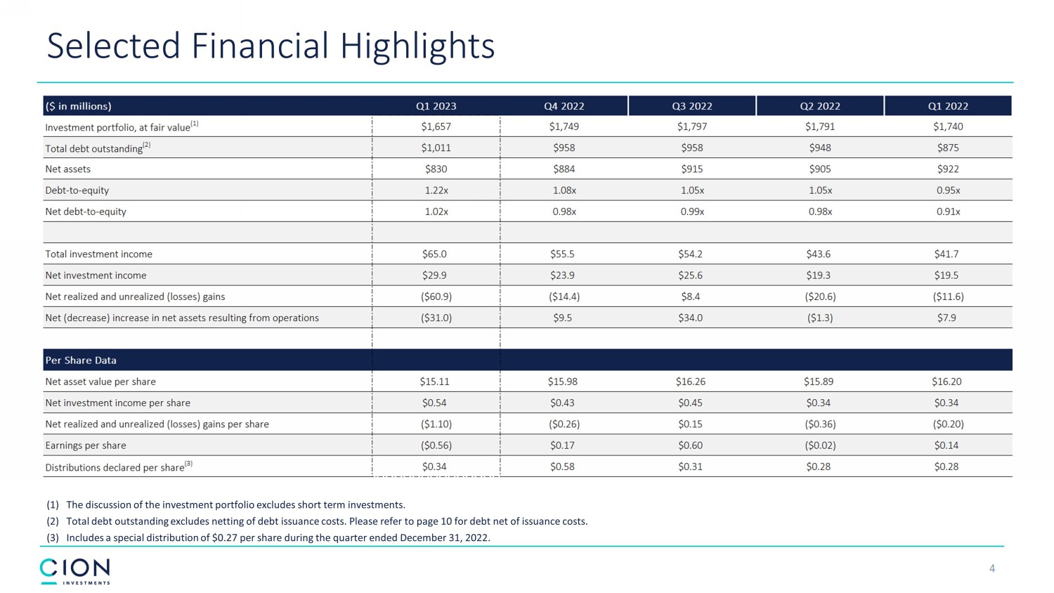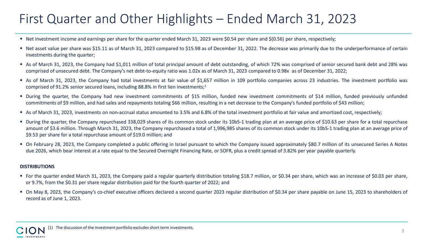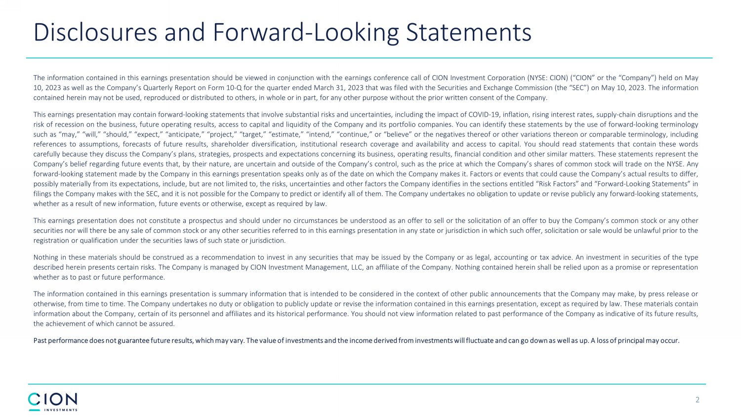 Disclosures and Forward - Looking Statements 2 The information contained in this earnings presentation should be viewed in conjunction with the earnings conference call of CION Investment Corporation (NYSE : CION) (“CION” or the “Company”) held on May 10 , 2023 as well as the Company’s Quarterly Report on Form 10 - Q for the quarter ended March 31 , 2023 that was filed with the Securities and Exchange Commission (the “SEC”) on May 10 , 2023 . The information contained herein may not be used, reproduced or distributed to others, in whole or in part, for any other purpose without the prior written consent of the Company . This earnings presentation may contain forward - looking statements that involve substantial risks and uncertainties, including the impact of COVID - 19 , inflation, rising interest rates, supply - chain disruptions and the risk of recession on the business, future operating results, access to capital and liquidity of the Company and its portfolio companies . You can identify these statements by the use of forward - looking terminology such as “may,” “will,” “should,” “expect,” “anticipate,” “project,” “target,” “estimate,” “intend,” “continue,” or “believe” or the negatives thereof or other variations thereon or comparable terminology, including references to assumptions, forecasts of future results, shareholder diversification, institutional research coverage and availability and access to capital . You should read statements that contain these words carefully because they discuss the Company’s plans, strategies, prospects and expectations concerning its business, operating results, financial condition and other similar matters . These statements represent the Company’s belief regarding future events that, by their nature, are uncertain and outside of the Company’s control, such as the price at which the Company’s shares of common stock will trade on the NYSE . Any forward - looking statement made by the Company in this earnings presentation speaks only as of the date on which the Company makes it . Factors or events that could cause the Company’s actual results to differ, possibly materially from its expectations, include, but are not limited to, the risks, uncertainties and other factors the Company identifies in the sections entitled “Risk Factors” and “Forward - Looking Statements” in filings the Company makes with the SEC, and it is not possible for the Company to predict or identify all of them . The Company undertakes no obligation to update or revise publicly any forward - looking statements, whether as a result of new information, future events or otherwise, except as required by law . This earnings presentation does not constitute a prospectus and should under no circumstances be understood as an offer to sell or the solicitation of an offer to buy the Company’s common stock or any other securities nor will there be any sale of common stock or any other securities referred to in this earnings presentation in any state or jurisdiction in which such offer, solicitation or sale would be unlawful prior to the registration or qualification under the securities laws of such state or jurisdiction . Nothing in these materials should be construed as a recommendation to invest in any securities that may be issued by the Company or as legal, accounting or tax advice . An investment in securities of the type described herein presents certain risks . The Company is managed by CION Investment Management, LLC, an affiliate of the Company . Nothing contained herein shall be relied upon as a promise or representation whether as to past or future performance . The information contained in this earnings presentation is summary information that is intended to be considered in the context of other public announcements that the Company may make, by press release or otherwise, from time to time . The Company undertakes no duty or obligation to publicly update or revise the information contained in this earnings presentation, except as required by law . These materials contain information about the Company, certain of its personnel and affiliates and its historical performance . You should not view information related to past performance of the Company as indicative of its future results, the achievement of which cannot be assured . Past performance does not guarantee future results, which may vary . The value of investments and the income derived from investments will fluctuate and can go down as well as up . A loss of principal may occur .