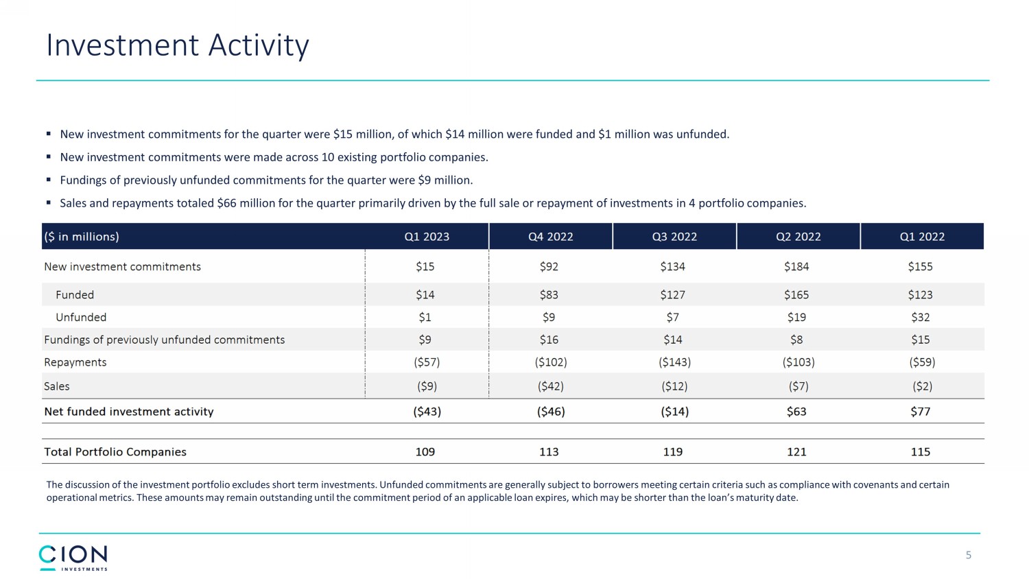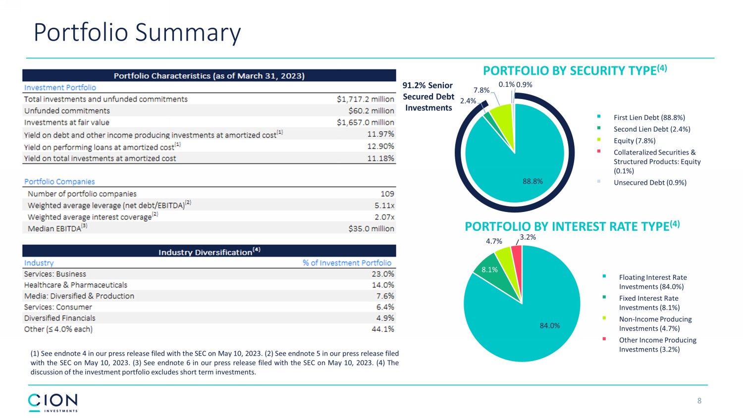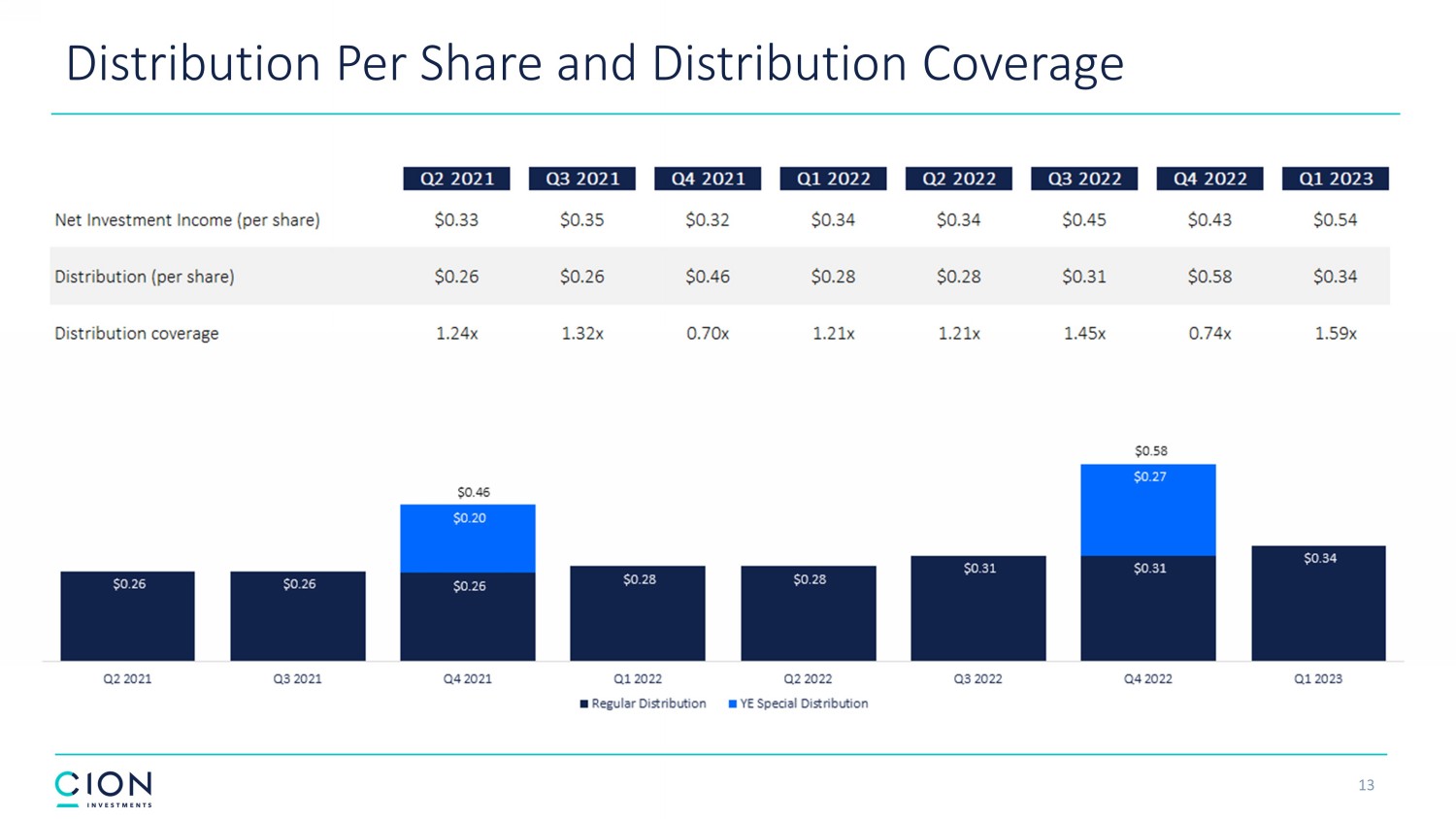 Disclosures and Forward - Looking Statements 2 The information contained in this earnings presentation should be viewed in conjunction with the earnings conference call of CION Investment Corporation (NYSE : CION) (“CION” or the “Company”) held on May 10 , 2023 as well as the Company’s Quarterly Report on Form 10 - Q for the quarter ended March 31 , 2023 that was filed with the Securities and Exchange Commission (the “SEC”) on May 10 , 2023 . The information contained herein may not be used, reproduced or distributed to others, in whole or in part, for any other purpose without the prior written consent of the Company . This earnings presentation may contain forward - looking statements that involve substantial risks and uncertainties, including the impact of COVID - 19 , inflation, rising interest rates, supply - chain disruptions and the risk of recession on the business, future operating results, access to capital and liquidity of the Company and its portfolio companies . You can identify these statements by the use of forward - looking terminology such as “may,” “will,” “should,” “expect,” “anticipate,” “project,” “target,” “estimate,” “intend,” “continue,” or “believe” or the negatives thereof or other variations thereon or comparable terminology, including references to assumptions, forecasts of future results, shareholder diversification, institutional research coverage and availability and access to capital . You should read statements that contain these words carefully because they discuss the Company’s plans, strategies, prospects and expectations concerning its business, operating results, financial condition and other similar matters . These statements represent the Company’s belief regarding future events that, by their nature, are uncertain and outside of the Company’s control, such as the price at which the Company’s shares of common stock will trade on the NYSE . Any forward - looking statement made by the Company in this earnings presentation speaks only as of the date on which the Company makes it . Factors or events that could cause the Company’s actual results to differ, possibly materially from its expectations, include, but are not limited to, the risks, uncertainties and other factors the Company identifies in the sections entitled “Risk Factors” and “Forward - Looking Statements” in filings the Company makes with the SEC, and it is not possible for the Company to predict or identify all of them . The Company undertakes no obligation to update or revise publicly any forward - looking statements, whether as a result of new information, future events or otherwise, except as required by law . This earnings presentation does not constitute a prospectus and should under no circumstances be understood as an offer to sell or the solicitation of an offer to buy the Company’s common stock or any other securities nor will there be any sale of common stock or any other securities referred to in this earnings presentation in any state or jurisdiction in which such offer, solicitation or sale would be unlawful prior to the registration or qualification under the securities laws of such state or jurisdiction . Nothing in these materials should be construed as a recommendation to invest in any securities that may be issued by the Company or as legal, accounting or tax advice . An investment in securities of the type described herein presents certain risks . The Company is managed by CION Investment Management, LLC, an affiliate of the Company . Nothing contained herein shall be relied upon as a promise or representation whether as to past or future performance . The information contained in this earnings presentation is summary information that is intended to be considered in the context of other public announcements that the Company may make, by press release or otherwise, from time to time . The Company undertakes no duty or obligation to publicly update or revise the information contained in this earnings presentation, except as required by law . These materials contain information about the Company, certain of its personnel and affiliates and its historical performance . You should not view information related to past performance of the Company as indicative of its future results, the achievement of which cannot be assured . Past performance does not guarantee future results, which may vary . The value of investments and the income derived from investments will fluctuate and can go down as well as up . A loss of principal may occur .