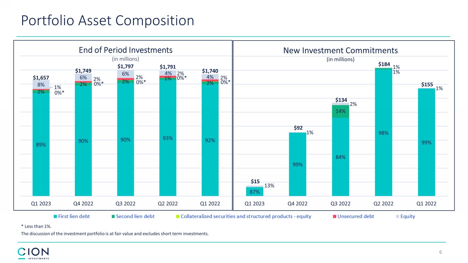 Investment Activity ▪ New investment commitments for the quarter were $15 million, of which $14 million were funded and $1 million was unfunded. ▪ New investment commitments were made across 10 existing portfolio companies. ▪ Fundings of previously unfunded commitments for the quarter were $9 million. ▪ Sales and repayments totaled $66 million for the quarter primarily driven by the full sale or repayment of investments in 4 p ort folio companies. The discussion of the investment portfolio excludes short term investments. Unfunded c ommitments are generally subject to borrowers meeting certain criteria such as compliance with covenants and certain operational metrics. These amounts may remain outstanding until the commitment period of an applicable loan expires, which ma y b e shorter than the loan’s maturity date. 5