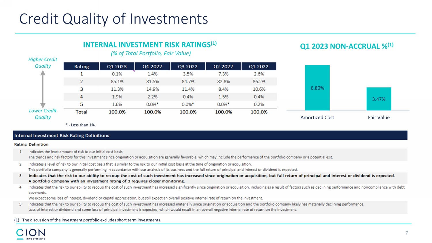 6 Portfolio Asset Composition 89% 90% 90% 93% 92% 2% 2% 2% 1% 2% 0% * 0% * 0% * 0% * 0% * 1% 2% 2% 2% 2% 8% 6% 6% 4% 4% $1,657 $1,749 $1,797 $1,791 $1,740 Q1 2023 Q4 2022 Q3 2022 Q2 2022 Q1 2022 End of Period Investments (in millions) * Less than 1%. The discussion of the investment portfolio is at fair value and excludes short term investments. 87% 99% 84% 98% 99% 14% 1% 13% 1% 2% 1% 1% $15 $92 $134 $184 $155 Q1 2023 Q4 2022 Q3 2022 Q2 2022 Q1 2022 New Investment Commitments (in millions)