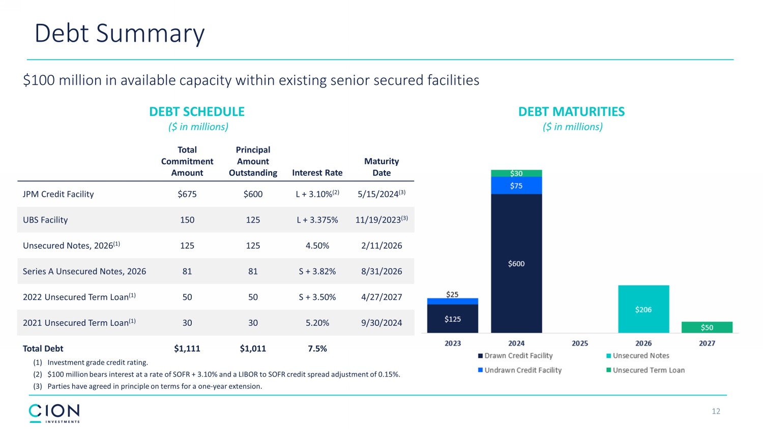 12 Total Commitment Amount Principal Amount Outstanding Interest Rate Maturity Date JPM Credit Facility $675 $600 L + 3.10% (2) 5/15/2024 (3) UBS Facility 150 125 L + 3.375% 11/19/2023 (3) Unsecured Notes, 2026 (1) 125 125 4.50% 2/11/2026 Series A Unsecured Notes, 2026 81 81 S + 3.82% 8/31/2026 2022 Unsecured Term Loan (1) 50 50 S + 3.50% 4/27/2027 2021 Unsecured Term Loan (1) 30 30 5.20% 9/30/2024 Total Debt $1,111 $1,011 7.5% Debt Summary DEBT MATURITIES ($ in millions) DEBT SCHEDULE ($ in millions) $100 million in available capacity within existing senior secured facilities (1) Investment grade credit rating. (2) $100 million bears interest at a rate of SOFR + 3.10% and a LIBOR to SOFR credit spread adjustment of 0.15%. (3) Parties have agreed in principle on terms for a one - year extension.