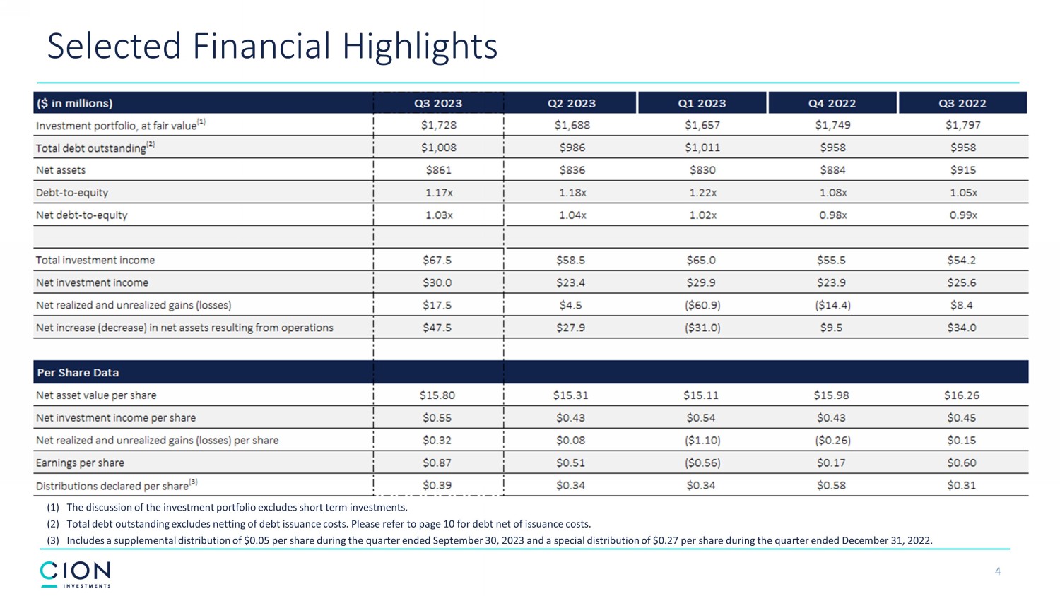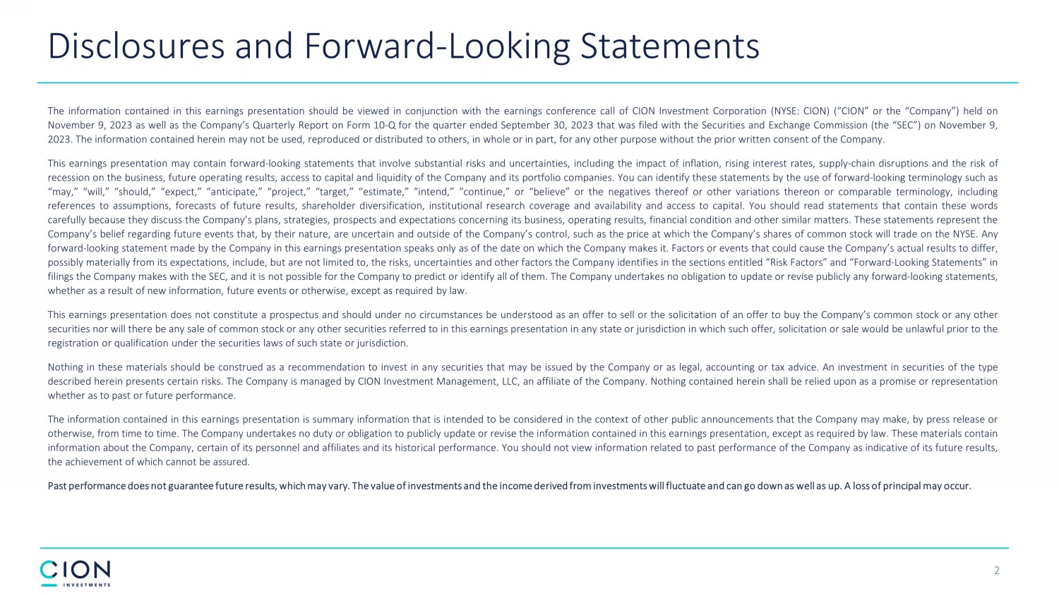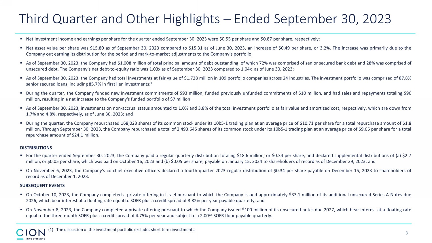 Disclosures and Forward - Looking Statements 2 The information contained in this earnings presentation should be viewed in conjunction with the earnings conference call of CION Investment Corporation (NYSE : CION) (“CION” or the “Company”) held on November 9 , 2023 as well as the Company’s Quarterly Report on Form 10 - Q for the quarter ended September 30 , 2023 that was filed with the Securities and Exchange Commission (the “SEC”) on November 9 , 2023 . The information contained herein may not be used, reproduced or distributed to others, in whole or in part, for any other purpose without the prior written consent of the Company . This earnings presentation may contain forward - looking statements that involve substantial risks and uncertainties, including the impact of inflation, rising interest rates, supply - chain disruptions and the risk of recession on the business, future operating results, access to capital and liquidity of the Company and its portfolio companies . You can identify these statements by the use of forward - looking terminology such as “may,” “will,” “should,” “expect,” “anticipate,” “project,” “target,” “estimate,” “intend,” “continue,” or “believe” or the negatives thereof or other variations thereon or comparable terminology, including references to assumptions, forecasts of future results, shareholder diversification, institutional research coverage and availability and access to capital . You should read statements that contain these words carefully because they discuss the Company’s plans, strategies, prospects and expectations concerning its business, operating results, financial condition and other similar matters . These statements represent the Company’s belief regarding future events that, by their nature, are uncertain and outside of the Company’s control, such as the price at which the Company’s shares of common stock will trade on the NYSE . Any forward - looking statement made by the Company in this earnings presentation speaks only as of the date on which the Company makes it . Factors or events that could cause the Company’s actual results to differ, possibly materially from its expectations, include, but are not limited to, the risks, uncertainties and other factors the Company identifies in the sections entitled “Risk Factors” and “Forward - Looking Statements” in filings the Company makes with the SEC, and it is not possible for the Company to predict or identify all of them . The Company undertakes no obligation to update or revise publicly any forward - looking statements, whether as a result of new information, future events or otherwise, except as required by law . This earnings presentation does not constitute a prospectus and should under no circumstances be understood as an offer to sell or the solicitation of an offer to buy the Company’s common stock or any other securities nor will there be any sale of common stock or any other securities referred to in this earnings presentation in any state or jurisdiction in which such offer, solicitation or sale would be unlawful prior to the registration or qualification under the securities laws of such state or jurisdiction . Nothing in these materials should be construed as a recommendation to invest in any securities that may be issued by the Company or as legal, accounting or tax advice . An investment in securities of the type described herein presents certain risks . The Company is managed by CION Investment Management, LLC, an affiliate of the Company . Nothing contained herein shall be relied upon as a promise or representation whether as to past or future performance . The information contained in this earnings presentation is summary information that is intended to be considered in the context of other public announcements that the Company may make, by press release or otherwise, from time to time . The Company undertakes no duty or obligation to publicly update or revise the information contained in this earnings presentation, except as required by law . These materials contain information about the Company, certain of its personnel and affiliates and its historical performance . You should not view information related to past performance of the Company as indicative of its future results, the achievement of which cannot be assured . Past performance does not guarantee future results, which may vary . The value of investments and the income derived from investments will fluctuate and can go down as well as up . A loss of principal may occur .