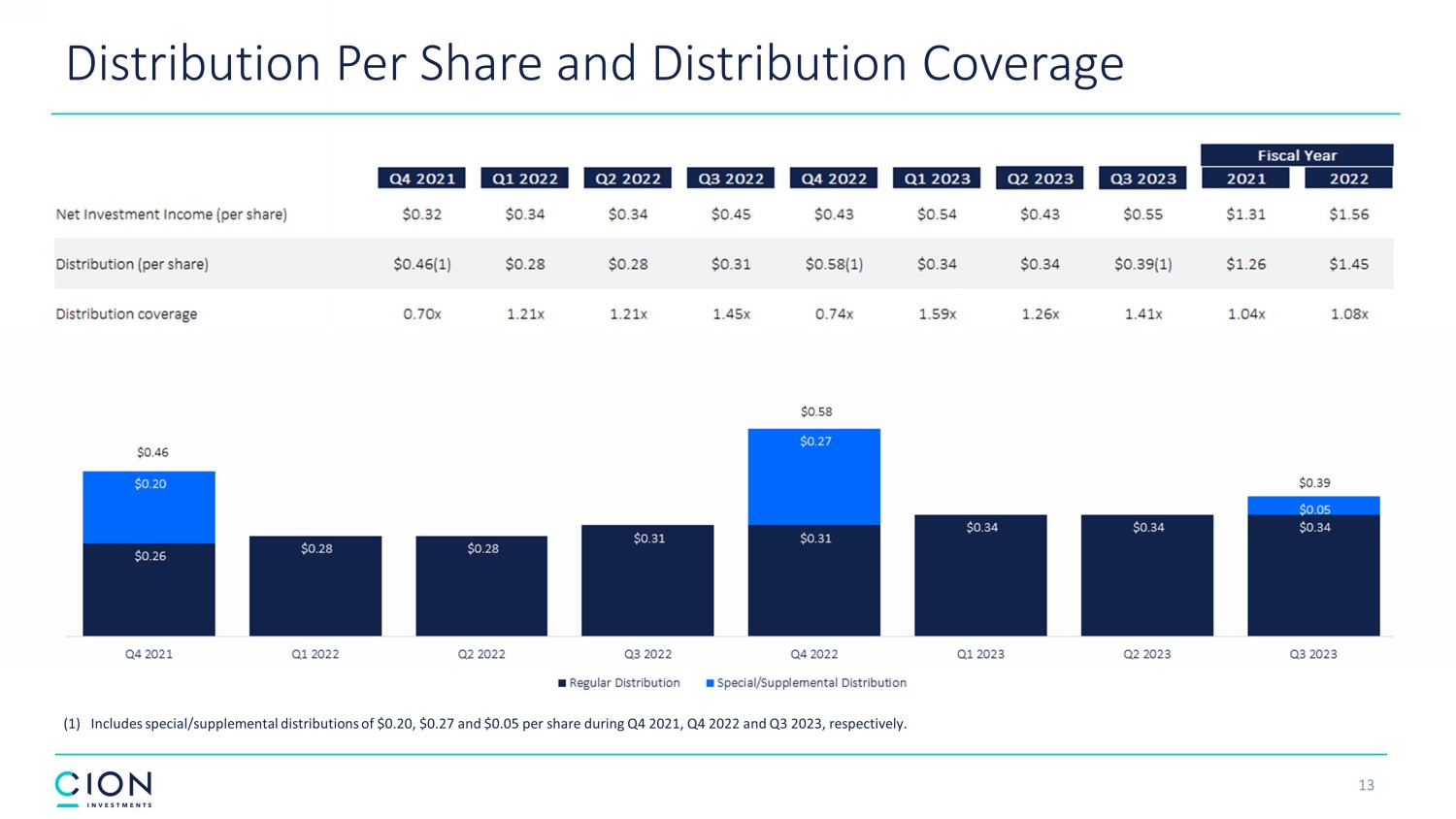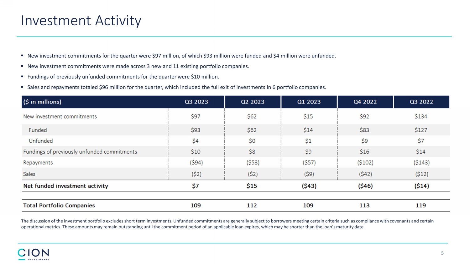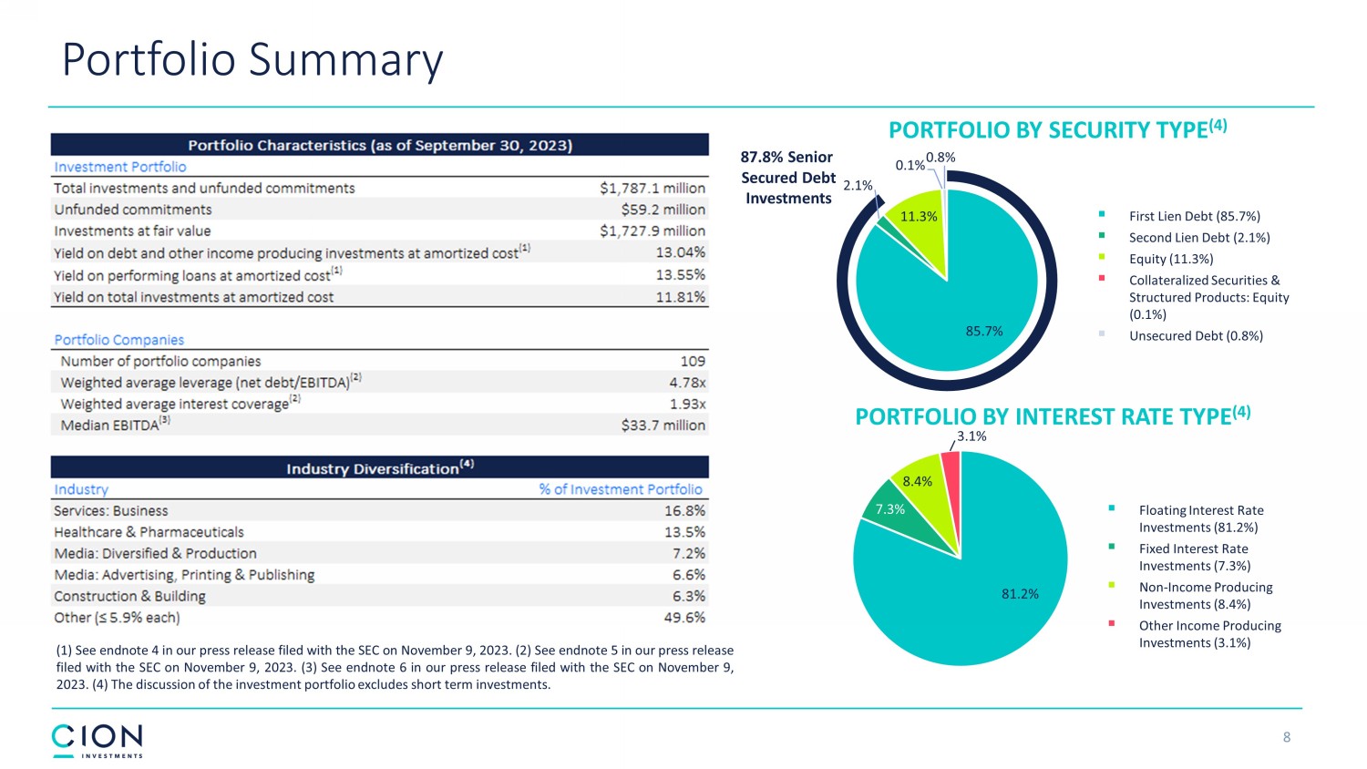 Disclosures and Forward - Looking Statements 2 The information contained in this earnings presentation should be viewed in conjunction with the earnings conference call of CION Investment Corporation (NYSE : CION) (“CION” or the “Company”) held on November 9 , 2023 as well as the Company’s Quarterly Report on Form 10 - Q for the quarter ended September 30 , 2023 that was filed with the Securities and Exchange Commission (the “SEC”) on November 9 , 2023 . The information contained herein may not be used, reproduced or distributed to others, in whole or in part, for any other purpose without the prior written consent of the Company . This earnings presentation may contain forward - looking statements that involve substantial risks and uncertainties, including the impact of inflation, rising interest rates, supply - chain disruptions and the risk of recession on the business, future operating results, access to capital and liquidity of the Company and its portfolio companies . You can identify these statements by the use of forward - looking terminology such as “may,” “will,” “should,” “expect,” “anticipate,” “project,” “target,” “estimate,” “intend,” “continue,” or “believe” or the negatives thereof or other variations thereon or comparable terminology, including references to assumptions, forecasts of future results, shareholder diversification, institutional research coverage and availability and access to capital . You should read statements that contain these words carefully because they discuss the Company’s plans, strategies, prospects and expectations concerning its business, operating results, financial condition and other similar matters . These statements represent the Company’s belief regarding future events that, by their nature, are uncertain and outside of the Company’s control, such as the price at which the Company’s shares of common stock will trade on the NYSE . Any forward - looking statement made by the Company in this earnings presentation speaks only as of the date on which the Company makes it . Factors or events that could cause the Company’s actual results to differ, possibly materially from its expectations, include, but are not limited to, the risks, uncertainties and other factors the Company identifies in the sections entitled “Risk Factors” and “Forward - Looking Statements” in filings the Company makes with the SEC, and it is not possible for the Company to predict or identify all of them . The Company undertakes no obligation to update or revise publicly any forward - looking statements, whether as a result of new information, future events or otherwise, except as required by law . This earnings presentation does not constitute a prospectus and should under no circumstances be understood as an offer to sell or the solicitation of an offer to buy the Company’s common stock or any other securities nor will there be any sale of common stock or any other securities referred to in this earnings presentation in any state or jurisdiction in which such offer, solicitation or sale would be unlawful prior to the registration or qualification under the securities laws of such state or jurisdiction . Nothing in these materials should be construed as a recommendation to invest in any securities that may be issued by the Company or as legal, accounting or tax advice . An investment in securities of the type described herein presents certain risks . The Company is managed by CION Investment Management, LLC, an affiliate of the Company . Nothing contained herein shall be relied upon as a promise or representation whether as to past or future performance . The information contained in this earnings presentation is summary information that is intended to be considered in the context of other public announcements that the Company may make, by press release or otherwise, from time to time . The Company undertakes no duty or obligation to publicly update or revise the information contained in this earnings presentation, except as required by law . These materials contain information about the Company, certain of its personnel and affiliates and its historical performance . You should not view information related to past performance of the Company as indicative of its future results, the achievement of which cannot be assured . Past performance does not guarantee future results, which may vary . The value of investments and the income derived from investments will fluctuate and can go down as well as up . A loss of principal may occur .