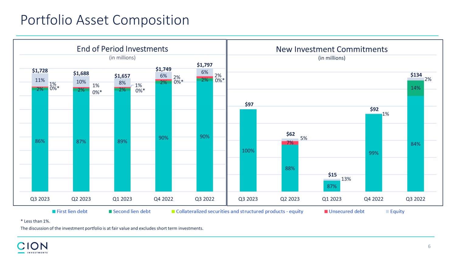 Investment Activity ▪ New investment commitments for the quarter were $97 million, of which $93 million were funded and $4 million were unfunded. ▪ New investment commitments were made across 3 new and 11 existing portfolio companies. ▪ Fundings of previously unfunded commitments for the quarter were $10 million. ▪ Sales and repayments totaled $96 million for the quarter, which included the full exit of investments in 6 portfolio companie s. The discussion of the investment portfolio excludes short term investments. Unfunded c ommitments are generally subject to borrowers meeting certain criteria such as compliance with covenants and certain operational metrics. These amounts may remain outstanding until the commitment period of an applicable loan expires, which ma y b e shorter than the loan’s maturity date. 5