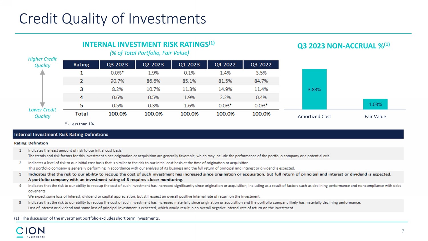 6 Portfolio Asset Composition 86% 87% 89% 90% 90% 2% 2% 2% 2% 2% 0% * 0% * 0% * 0% * 0% * 1% 1% 1% 2% 2% 11% 10% 8% 6% 6% $1,728 $1,688 $1,657 $1,749 $1,797 Q3 2023 Q2 2023 Q1 2023 Q4 2022 Q3 2022 End of Period Investments (in millions) * Less than 1%. The discussion of the investment portfolio is at fair value and excludes short term investments. 100% 88% 87% 99% 84% 14% 7% 5% 13% 1% 2% $97 $62 $15 $92 $134 Q3 2023 Q2 2023 Q1 2023 Q4 2022 Q3 2022 New Investment Commitments (in millions)