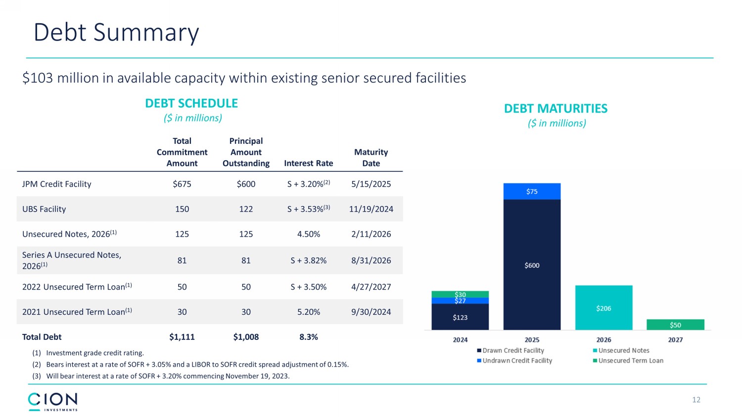 12 Total Commitment Amount Principal Amount Outstanding Interest Rate Maturity Date JPM Credit Facility $675 $600 S + 3.20% (2) 5/15/2025 UBS Facility 150 122 S + 3.53% (3) 11/19/2024 Unsecured Notes, 2026 (1) 125 125 4.50% 2/11/2026 Series A Unsecured Notes, 2026 (1) 81 81 S + 3.82% 8/31/2026 2022 Unsecured Term Loan (1) 50 50 S + 3.50% 4/27/2027 2021 Unsecured Term Loan (1) 30 30 5.20% 9/30/2024 Total Debt $1,111 $1,008 8.3% Debt Summary DEBT MATURITIES ($ in millions) DEBT SCHEDULE ($ in millions) $103 million in available capacity within existing senior secured facilities (1) Investment grade credit rating. (2) Bears interest at a rate of SOFR + 3.05% and a LIBOR to SOFR credit spread adjustment of 0.15%. (3) Will bear interest at a rate of SOFR + 3.20% commencing November 19, 2023.