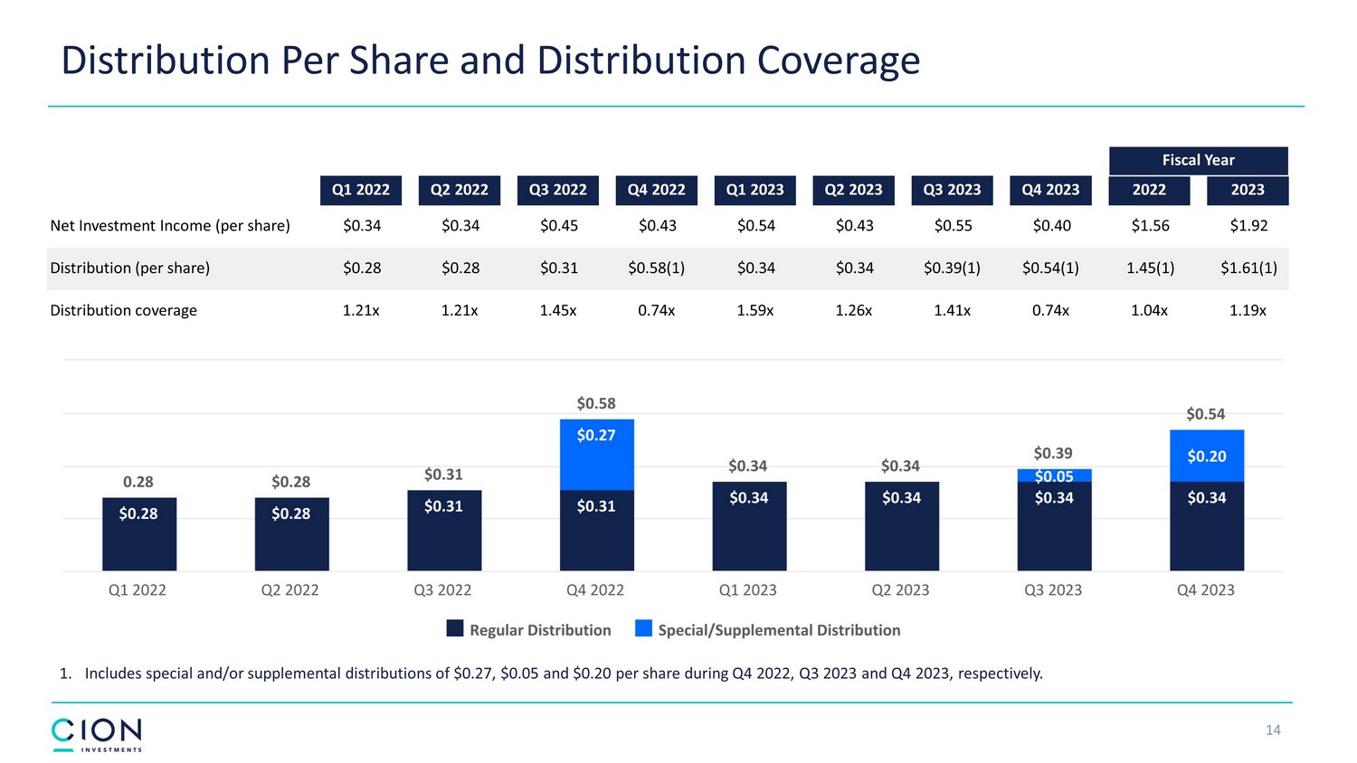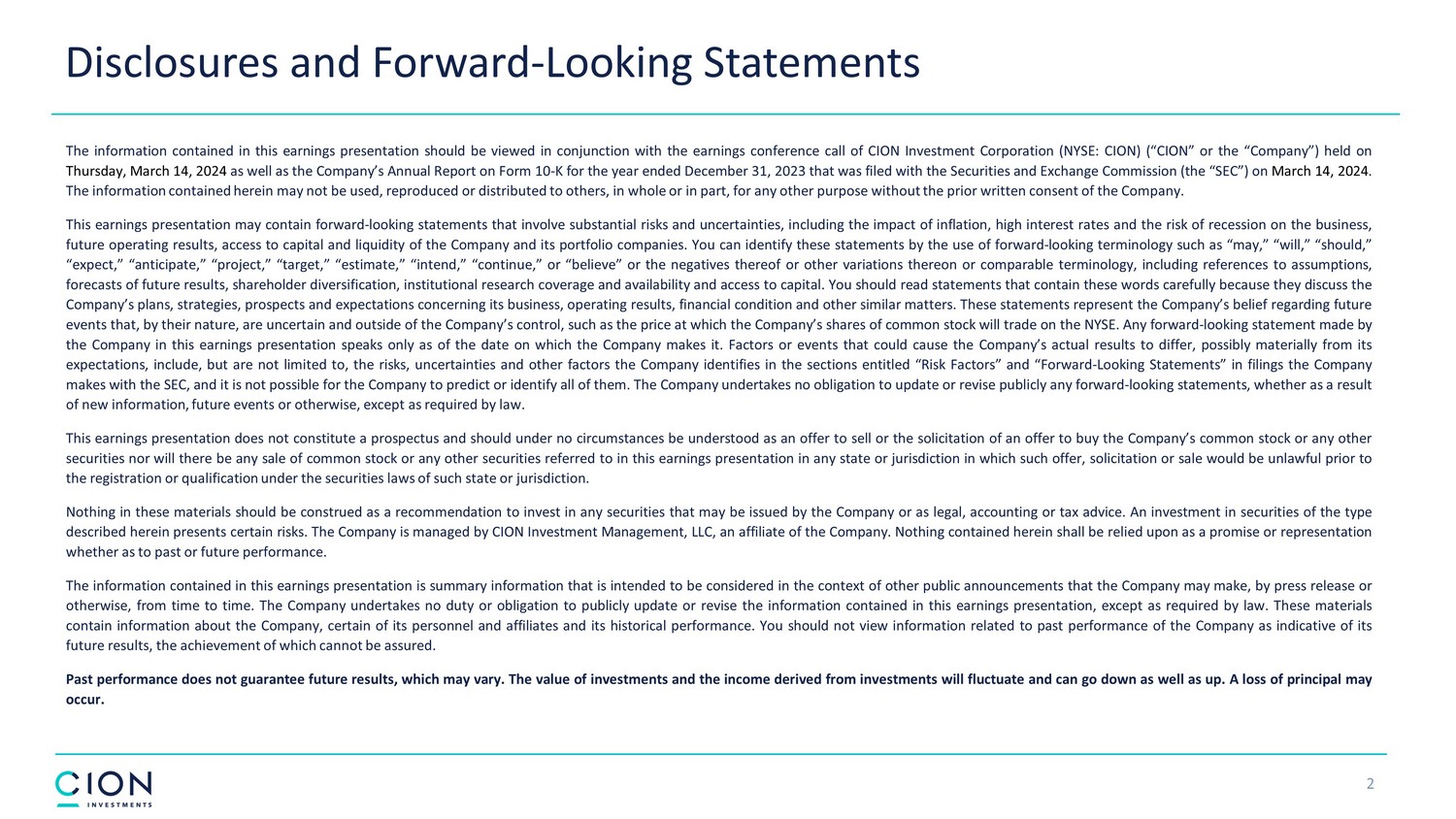 Disclosures and Forward - Looking Statements 2 The information contained in this earnings presentation should be viewed in conjunction with the earnings conference call of CION Investment Corporation (NYSE : CION) (“CION” or the “Company”) held on Thursday, March 14 , 2024 as well as the Company’s Annual Report on Form 10 - K for the year ended December 31 , 2023 that was filed with the Securities and Exchange Commission (the “SEC”) on March 14 , 2024 . The information contained herein may not be used, reproduced or distributed to others, in whole or in part, for any other purpose without the prior written consent of the Company . This earnings presentation may contain forward - looking statements that involve substantial risks and uncertainties, including the impact of inflation, high interest rates and the risk of recession on the business, future operating results, access to capital and liquidity of the Company and its portfolio companies . You can identify these statements by the use of forward - looking terminology such as “may,” “will,” “should,” “expect,” “anticipate,” “project,” “target,” “estimate,” “intend,” “continue,” or “believe” or the negatives thereof or other variations thereon or comparable terminology, including references to assumptions, forecasts of future results, shareholder diversification, institutional research coverage and availability and access to capital . You should read statements that contain these words carefully because they discuss the Company’s plans, strategies, prospects and expectations concerning its business, operating results, financial condition and other similar matters . These statements represent the Company’s belief regarding future events that, by their nature, are uncertain and outside of the Company’s control, such as the price at which the Company’s shares of common stock will trade on the NYSE . Any forward - looking statement made by the Company in this earnings presentation speaks only as of the date on which the Company makes it . Factors or events that could cause the Company’s actual results to differ, possibly materially from its expectations, include, but are not limited to, the risks, uncertainties and other factors the Company identifies in the sections entitled “Risk Factors” and “Forward - Looking Statements” in filings the Company makes with the SEC, and it is not possible for the Company to predict or identify all of them . The Company undertakes no obligation to update or revise publicly any forward - looking statements, whether as a result of new information, future events or otherwise, except as required by law . This earnings presentation does not constitute a prospectus and should under no circumstances be understood as an offer to sell or the solicitation of an offer to buy the Company’s common stock or any other securities nor will there be any sale of common stock or any other securities referred to in this earnings presentation in any state or jurisdiction in which such offer, solicitation or sale would be unlawful prior to the registration or qualification under the securities laws of such state or jurisdiction . Nothing in these materials should be construed as a recommendation to invest in any securities that may be issued by the Company or as legal, accounting or tax advice . An investment in securities of the type described herein presents certain risks . The Company is managed by CION Investment Management, LLC, an affiliate of the Company . Nothing contained herein shall be relied upon as a promise or representation whether as to past or future performance . The information contained in this earnings presentation is summary information that is intended to be considered in the context of other public announcements that the Company may make, by press release or otherwise, from time to time . The Company undertakes no duty or obligation to publicly update or revise the information contained in this earnings presentation, except as required by law . These materials contain information about the Company, certain of its personnel and affiliates and its historical performance . You should not view information related to past performance of the Company as indicative of its future results, the achievement of which cannot be assured . Past performance does not guarantee future results, which may vary . The value of investments and the income derived from investments will fluctuate and can go down as well as up . A loss of principal may occur .