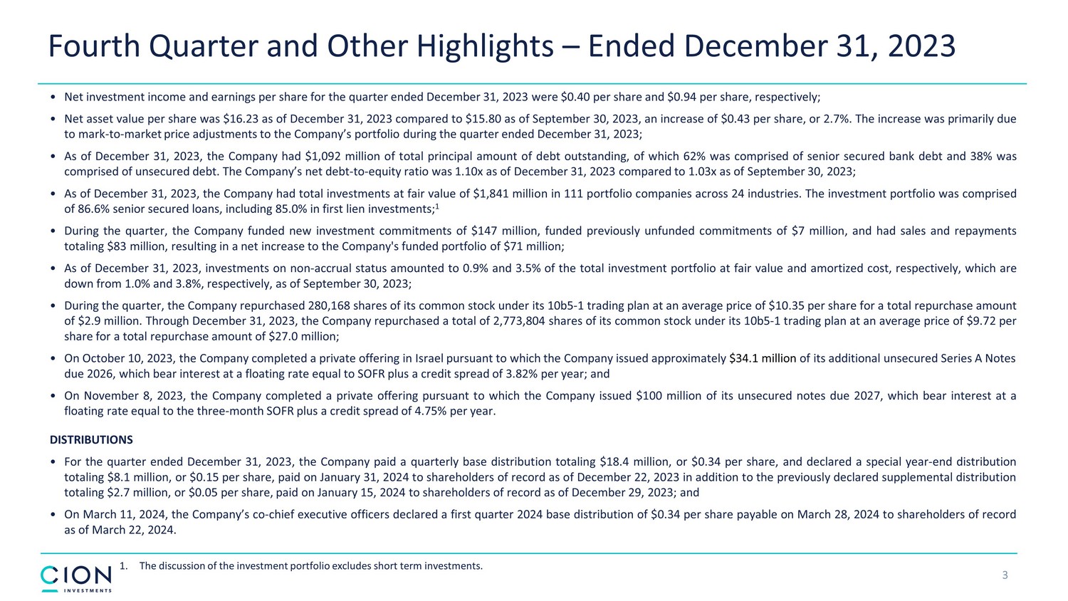 3 1. The discussion of the investment portfolio excludes short term investments. Fourth Quarter and Other Highlights – Ended December 31, 2023 • Net investment income and earnings per share for the quarter ended December 31 , 2023 were $ 0 . 40 per share and $ 0 . 94 per share, respectively ; • Net asset value per share was $ 16 . 23 as of December 31 , 2023 compared to $ 15 . 80 as of September 30 , 2023 , an increase of $ 0 . 43 per share, or 2 . 7 % . The increase was primarily due to mark - to - market price adjustments to the Company’s portfolio during the quarter ended December 31 , 2023 ; • As of December 31 , 2023 , the Company had $ 1 , 092 million of total principal amount of debt outstanding, of which 62 % was comprised of senior secured bank debt and 38 % was comprised of unsecured debt . The Company’s net debt - to - equity ratio was 1 . 10 x as of December 31 , 2023 compared to 1 . 03 x as of September 30 , 2023 ; • As of December 31 , 2023 , the Company had total investments at fair value of $ 1 , 841 million in 111 portfolio companies across 24 industries . The investment portfolio was comprised of 86 . 6 % senior secured loans, including 85 . 0 % in first lien investments ; 1 • During the quarter, the Company funded new investment commitments of $ 147 million, funded previously unfunded commitments of $ 7 million, and had sales and repayments totaling $ 83 million, resulting in a net increase to the Company's funded portfolio of $ 71 million ; • As of December 31 , 2023 , investments on non - accrual status amounted to 0 . 9 % and 3 . 5 % of the total investment portfolio at fair value and amortized cost, respectively, which are down from 1 . 0 % and 3 . 8 % , respectively, as of September 30 , 2023 ; • During the quarter, the Company repurchased 280 , 168 shares of its common stock under its 10 b 5 - 1 trading plan at an average price of $ 10 . 35 per share for a total repurchase amount of $ 2 . 9 million . Through December 31 , 2023 , the Company repurchased a total of 2 , 773 , 804 shares of its common stock under its 10 b 5 - 1 trading plan at an average price of $ 9 . 72 per share for a total repurchase amount of $ 27 . 0 million ; • On October 10, 2023, the Company completed a private offering in Israel pursuant to which the Company issued approximately $34.1 million of its additional unsecured Series A Notes due 2026, which bear interest at a floating rate equal to SOFR plus a credit spread of 3.82% per year; and • On November 8 , 2023 , the Company completed a private offering pursuant to which the Company issued $ 100 million of its unsecured notes due 2027 , which bear interest at a floating rate equal to the three - month SOFR plus a credit spread of 4 . 75 % per year . DISTRIBUTIONS • For the quarter ended December 31 , 2023 , the Company paid a quarterly base distribution totaling $ 18 . 4 million, or $ 0 . 34 per share, and declared a special year - end distribution totaling $ 8 . 1 million, or $ 0 . 15 per share, paid on January 31 , 2024 to shareholders of record as of December 22 , 2023 in addition to the previously declared supplemental distribution totaling $ 2 . 7 million, or $ 0 . 05 per share, paid on January 15 , 2024 to shareholders of record as of December 29 , 2023 ; and • On March 11 , 2024 , the Company’s co - chief executive officers declared a first quarter 2024 base distribution of $ 0 . 34 per share payable on March 28 , 2024 to shareholders of record as of March 22 , 2024 .