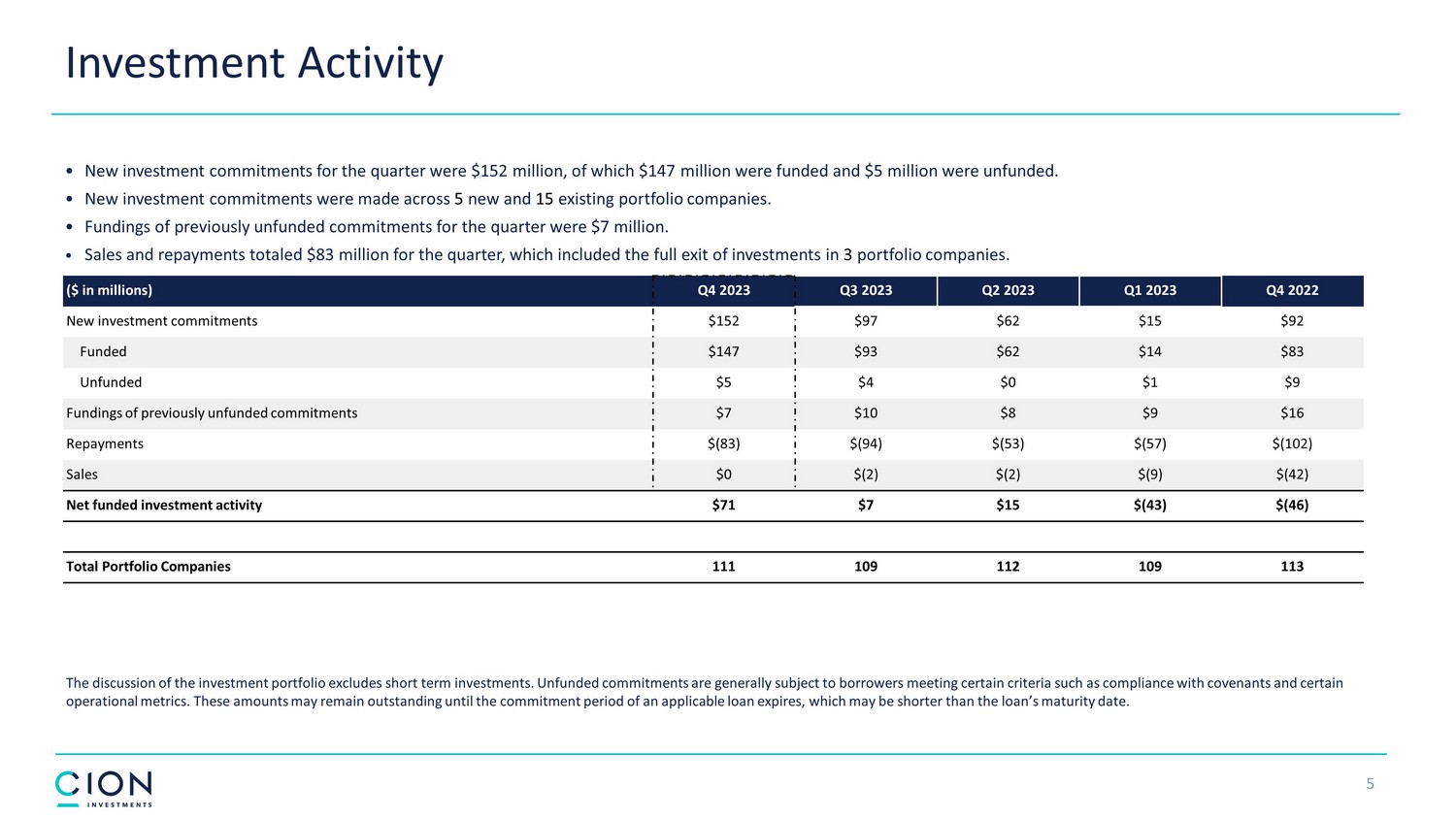 4 Selected Financial Highlights 1. The discussion of the investment portfolio excludes short term investments. 2. Total debt outstanding excludes netting of debt issuance costs. Please refer to page 10 for debt net of issuance costs. 3. Includes supplemental distributions of $0.05 per share during each quarter ended September 30, 2023 and December 31, 2023 and sp ecial distributions of $0.15 per share and $0.27 per share during the quarters ended December 31, 2023 and 2022, respectively. ($ in millions) Q4 2023 Q3 2023 Q2 2023 Q1 2023 Q4 2022 Investment portfolio, at fair value (1) $1,841 $1,728 $1,688 $1,657 $1,749 Total debt outstanding (2) $1,092 $1,008 $986 $1,011 $958 Net assets $880 $861 $836 $830 $884 Debt - to - equity 1.24x 1.17x 1.18x 1.22x 1.08x Net debt - to - equity 1.10x 1.03x 1.04x 1.02x 0.98x Total investment income $60.0 $67.5 $58.5 $65.0 $55.5 Net investment income $21.8 $30.0 $23.4 $29.9 $23.9 Net realized and unrealized gains (losses) $29.2 $17.5 $4.5 $(60.9) $(14.4) Net increase (decrease) in net assets resulting from operations $51.0 $47.5 $27.9 $(31.0) $9.5 Per Share Data Net asset value per share $16.23 $15.80 $15.31 $15.11 $15.98 Net investment income per share $0.40 $0.55 $0.43 $0.54 $0.43 Net realized and unrealized gains (losses) per share $0.54 $0.32 $0.08 $(1.10) $(0.26) Earnings per share $0.94 $0.87 $0.51 $(0.56) $0.17 Distributions declared per share (3) $0.54 $0.39 $0.34 $0.34 $0.58