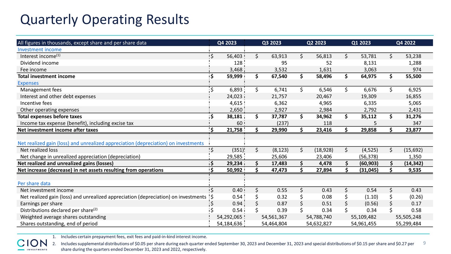 Quarterly Operating Results 9 All figures in thousands, except share and per share data Q4 2023 Q3 2023 Q2 2023 Q1 2023 Q4 2022 Investment income Interest income (1) $ 56,403 $ 63,913 $ 56,813 $ 53,781 $ 53,238 Dividend income 128 95 52 8,131 1,288 Fee income 3,468 3,532 1,631 3,063 974 Total investment income $ 59,999 $ 67,540 $ 58,496 $ 64,975 $ 55,500 Expenses Management fees $ 6,893 $ 6,741 $ 6,546 $ 6,676 $ 6,925 Interest and other debt expenses 24,023 21,757 20,467 19,309 16,855 Incentive fees 4,615 6,362 4,965 6,335 5,065 Other operating expenses 2,650 2,927 2,984 2,792 2,431 Total expenses before taxes $ 38,181 $ 37,787 $ 34,962 $ 35,112 $ 31,276 Income tax expense (benefit), including excise tax 60 (237) 118 5 347 Net investment income after taxes $ 21,758 $ 29,990 $ 23,416 $ 29,858 $ 23,877 Net realized gain (loss) and unrealized appreciation (depreciation) on investments Net realized loss $ (351) $ (8,123) $ (18,928) $ (4,525) $ (15,692) Net change in unrealized appreciation (depreciation) 29,585 25,606 23,406 (56,378) 1,350 Net realized and unrealized gains (losses) $ 29,234 $ 17,483 $ 4,478 $ (60,903) $ (14,342) Net increase (decrease) in net assets resulting from operations $ 50,992 $ 47,473 $ 27,894 $ (31,045) $ 9,535 Per share data Net investment income $ 0.40 $ 0.55 $ 0.43 $ 0.54 $ 0.43 Net realized gain (loss) and unrealized appreciation (depreciation) on investments $ 0.54 $ 0.32 $ 0.08 $ (1.10) $ (0.26) Earnings per share $ 0.94 $ 0.87 $ 0.51 $ (0.56) $ 0.17 Distributions declared per share (2) $ 0.54 $ 0.39 $ 0.34 $ 0.34 $ 0.58 Weighted average shares outstanding 54,292,065 54,561,367 54,788,740 55,109,482 55,505,248 Shares outstanding, end of period 54,184,636 54,464,804 54,632,827 54,961,455 55,299,484 1. Includes certain prepayment fees, exit fees and paid - in - kind interest income. 2. Includes supplemental distributions of $0.05 per share during each quarter ended September 30, 2023 and December 31, 2023 and sp ecial distributions of $0.15 per share and $0.27 per share during the quarters ended December 31, 2023 and 2022, respectively.
