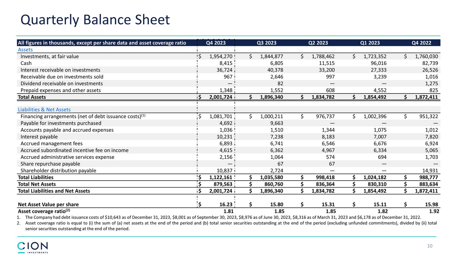 Quarterly Balance Sheet 10 All figures in thousands, except per share data and asset coverage ratio Q4 2023 Q3 2023 Q2 2023 Q1 2023 Q4 2022 Assets Investments, at fair value $ 1,954,270 $ 1,844,877 $ 1,788,462 $ 1,723,352 $ 1,760,030 Cash 8,415 6,805 11,515 96,016 82,739 Interest receivable on investments 36,724 40,378 33,200 27,333 26,526 Receivable due on investments sold 967 2,646 997 3,239 1,016 Dividend receivable on investments — 82 — — 1,275 Prepaid expenses and other assets 1,348 1,552 608 4,552 825 Total Assets $ 2,001,724 $ 1,896,340 $ 1,834,782 $ 1,854,492 $ 1,872,411 Liabilities & Net Assets Financing arrangements (net of debt issuance costs) (1) $ 1,081,701 $ 1,000,211 $ 976,737 $ 1,002,396 $ 951,322 Payable for investments purchased 4,692 9,663 — — — Accounts payable and accrued expenses 1,036 1,510 1,344 1,075 1,012 Interest payable 10,231 7,238 8,183 7,007 7,820 Accrued management fees 6,893 6,741 6,546 6,676 6,924 Accrued subordinated incentive fee on income 4,615 6,362 4,967 6,334 5,065 Accrued administrative services expense 2,156 1,064 574 694 1,703 Share repurchase payable — 67 67 — — Shareholder distribution payable 10,837 2,724 — — 14,931 Total Liabilities $ 1,122,161 $ 1,035,580 $ 998,418 $ 1,024,182 $ 988,777 Total Net Assets $ 879,563 $ 860,760 $ 836,364 $ 830,310 $ 883,634 Total Liabilities and Net Assets $ 2,001,724 $ 1,896,340 $ 1,834,782 $ 1,854,492 $ 1,872,411 Net Asset Value per share $ 16.23 $ 15.80 $ 15.31 $ 15.11 $ 15.98 Asset coverage ratio (2) 1.81 1.85 1.85 1.82 1.92 1. The Company had debt issuance costs of $ 10 , 643 as of December 31 , 2023 , $ 8 , 001 as of September 30 , 2023 , $ 8 , 976 as of June 30 , 2023 , $ 8 , 316 as of March 31 , 2023 and $ 6 , 178 as of December 31 , 2022 . 2. Asset coverage ratio is equal to (i) the sum of (a) net assets at the end of the period and (b) total senior securities outstanding at the end of the period (excluding unfunded commitments), divided by (ii) total senior securities outstanding at the end of the period .