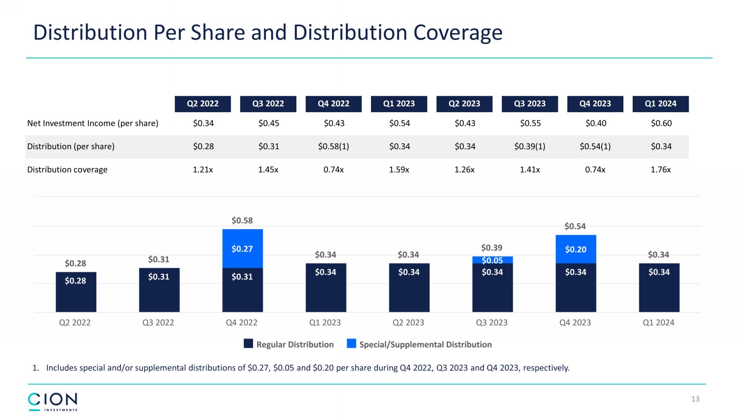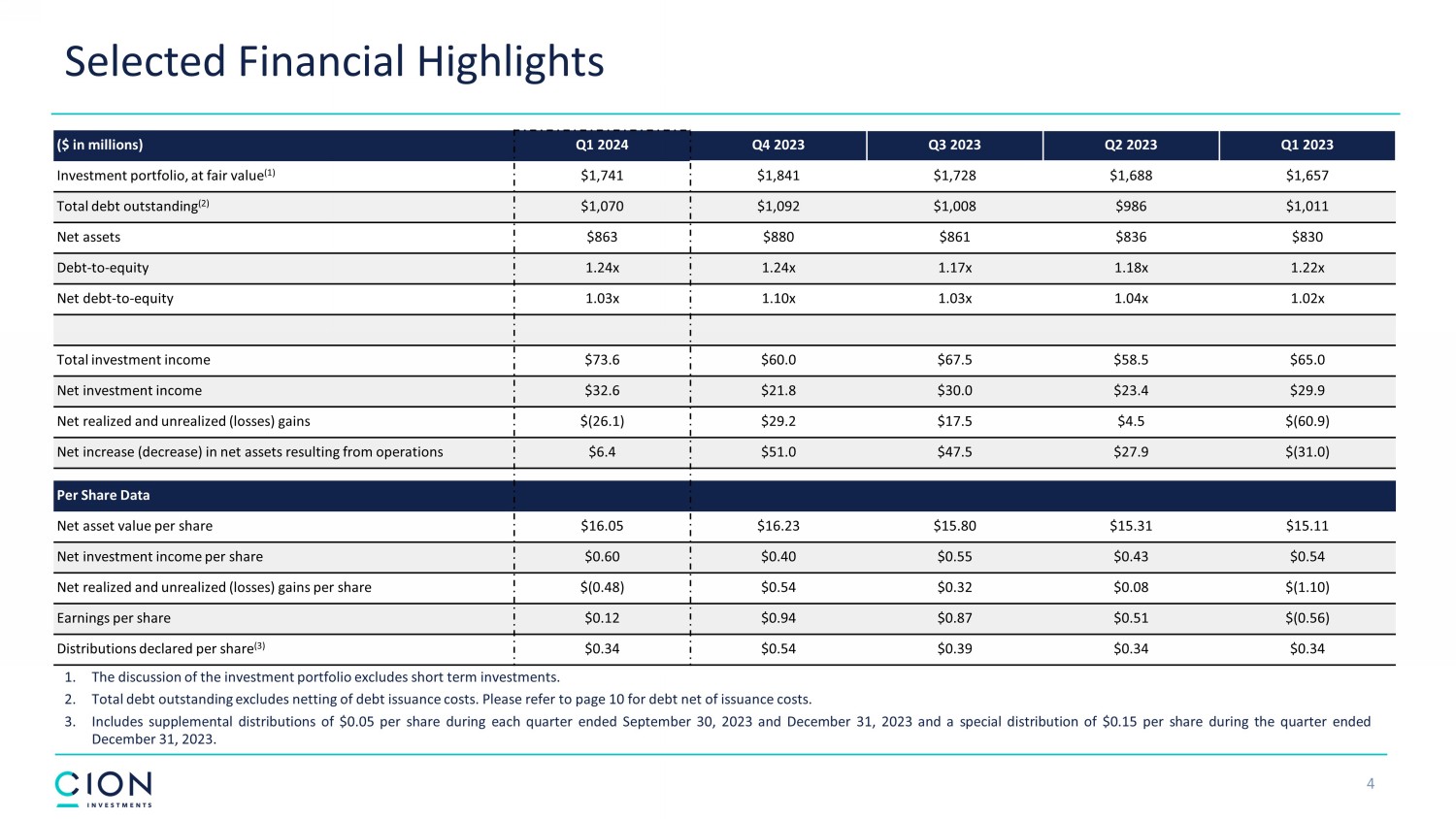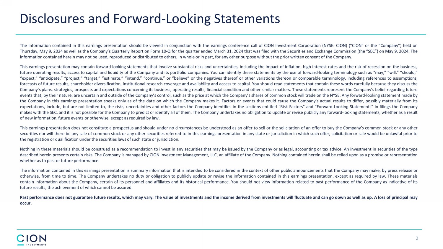 Disclosures and Forward - Looking Statements 2 The information contained in this earnings presentation should be viewed in conjunction with the earnings conference call of CION Investment Corporation (NYSE : CION) (“CION” or the “Company”) held on Thursday, May 9 , 2024 as well as the Company’s Quarterly Report on Form 10 - Q for the quarter ended March 31 , 2024 that was filed with the Securities and Exchange Commission (the “SEC”) on May 9 , 2024 . The information contained herein may not be used, reproduced or distributed to others, in whole or in part, for any other purpose without the prior written consent of the Company . This earnings presentation may contain forward - looking statements that involve substantial risks and uncertainties, including the impact of inflation, high interest rates and the risk of recession on the business, future operating results, access to capital and liquidity of the Company and its portfolio companies . You can identify these statements by the use of forward - looking terminology such as “may,” “will,” “should,” “expect,” “anticipate,” “project,” “target,” “estimate,” “intend,” “continue,” or “believe” or the negatives thereof or other variations thereon or comparable terminology, including references to assumptions, forecasts of future results, shareholder diversification, institutional research coverage and availability and access to capital . You should read statements that contain these words carefully because they discuss the Company’s plans, strategies, prospects and expectations concerning its business, operating results, financial condition and other similar matters . These statements represent the Company’s belief regarding future events that, by their nature, are uncertain and outside of the Company’s control, such as the price at which the Company’s shares of common stock will trade on the NYSE . Any forward - looking statement made by the Company in this earnings presentation speaks only as of the date on which the Company makes it . Factors or events that could cause the Company’s actual results to differ, possibly materially from its expectations, include, but are not limited to, the risks, uncertainties and other factors the Company identifies in the sections entitled “Risk Factors” and “Forward - Looking Statements” in filings the Company makes with the SEC, and it is not possible for the Company to predict or identify all of them . The Company undertakes no obligation to update or revise publicly any forward - looking statements, whether as a result of new information, future events or otherwise, except as required by law . This earnings presentation does not constitute a prospectus and should under no circumstances be understood as an offer to sell or the solicitation of an offer to buy the Company’s common stock or any other securities nor will there be any sale of common stock or any other securities referred to in this earnings presentation in any state or jurisdiction in which such offer, solicitation or sale would be unlawful prior to the registration or qualification under the securities laws of such state or jurisdiction . Nothing in these materials should be construed as a recommendation to invest in any securities that may be issued by the Company or as legal, accounting or tax advice . An investment in securities of the type described herein presents certain risks . The Company is managed by CION Investment Management, LLC, an affiliate of the Company . Nothing contained herein shall be relied upon as a promise or representation whether as to past or future performance . The information contained in this earnings presentation is summary information that is intended to be considered in the context of other public announcements that the Company may make, by press release or otherwise, from time to time . The Company undertakes no duty or obligation to publicly update or revise the information contained in this earnings presentation, except as required by law . These materials contain information about the Company, certain of its personnel and affiliates and its historical performance . You should not view information related to past performance of the Company as indicative of its future results, the achievement of which cannot be assured . Past performance does not guarantee future results, which may vary . The value of investments and the income derived from investments will fluctuate and can go down as well as up . A loss of principal may occur .