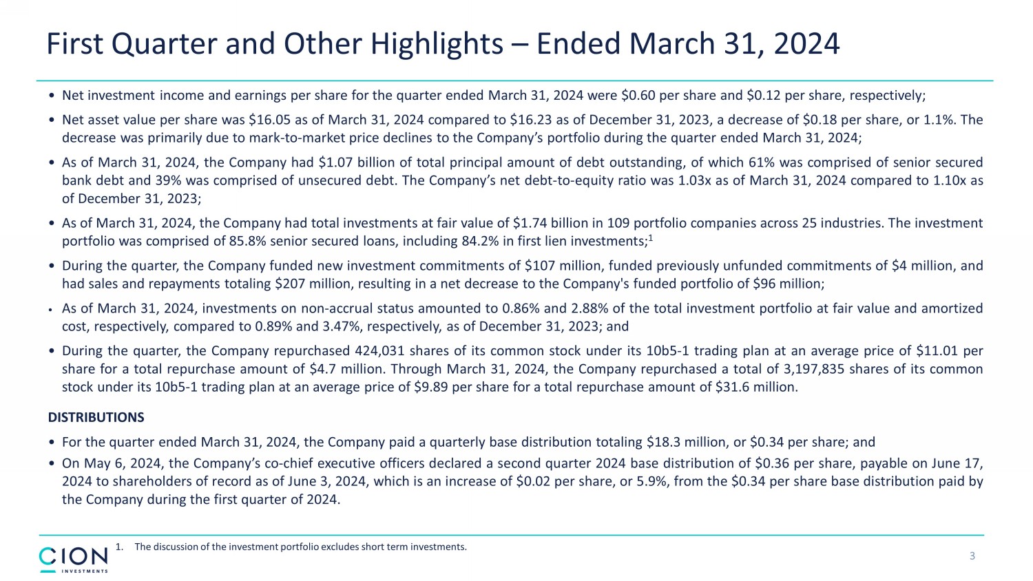 3 1. The discussion of the investment portfolio excludes short term investments. First Quarter and Other Highlights – Ended March 31, 2024 • Net investment income and earnings per share for the quarter ended March 31 , 2024 were $ 0 . 60 per share and $ 0 . 12 per share, respectively ; • Net asset value per share was $ 16 . 05 as of March 31 , 2024 compared to $ 16 . 23 as of December 31 , 2023 , a decrease of $ 0 . 18 per share, or 1 . 1 % . The decrease was primarily due to mark - to - market price declines to the Company’s portfolio during the quarter ended March 31 , 2024 ; • As of March 31 , 2024 , the Company had $ 1 . 07 billion of total principal amount of debt outstanding, of which 61 % was comprised of senior secured bank debt and 39 % was comprised of unsecured debt . The Company’s net debt - to - equity ratio was 1 . 03 x as of March 31 , 2024 compared to 1 . 10 x as of December 31 , 2023 ; • As of March 31 , 2024 , the Company had total investments at fair value of $ 1 . 74 billion in 109 portfolio companies across 25 industries . The investment portfolio was comprised of 85 . 8 % senior secured loans, including 84 . 2 % in first lien investments ; 1 • During the quarter, the Company funded new investment commitments of $ 107 million, funded previously unfunded commitments of $ 4 million, and had sales and repayments totaling $ 207 million, resulting in a net decrease to the Company's funded portfolio of $ 96 million ; • As of March 31 , 2024 , investments on non - accrual status amounted to 0 . 86 % and 2 . 88 % of the total investment portfolio at fair value and amortized cost, respectively, compared to 0 . 89 % and 3 . 47 % , respectively, as of December 31 , 2023 ; and • During the quarter, the Company repurchased 424 , 031 shares of its common stock under its 10 b 5 - 1 trading plan at an average price of $ 11 . 01 per share for a total repurchase amount of $ 4 . 7 million . Through March 31 , 2024 , the Company repurchased a total of 3 , 197 , 835 shares of its common stock under its 10 b 5 - 1 trading plan at an average price of $ 9 . 89 per share for a total repurchase amount of $ 31 . 6 million . DISTRIBUTIONS • For the quarter ended March 31 , 2024 , the Company paid a quarterly base distribution totaling $ 18 . 3 million, or $ 0 . 34 per share ; and • On May 6 , 2024 , the Company’s co - chief executive officers declared a second quarter 2024 base distribution of $ 0 . 36 per share, payable on June 17 , 2024 to shareholders of record as of June 3 , 2024 , which is an increase of $ 0 . 02 per share, or 5 . 9 % , from the $ 0 . 34 per share base distribution paid by the Company during the first quarter of 2024 .