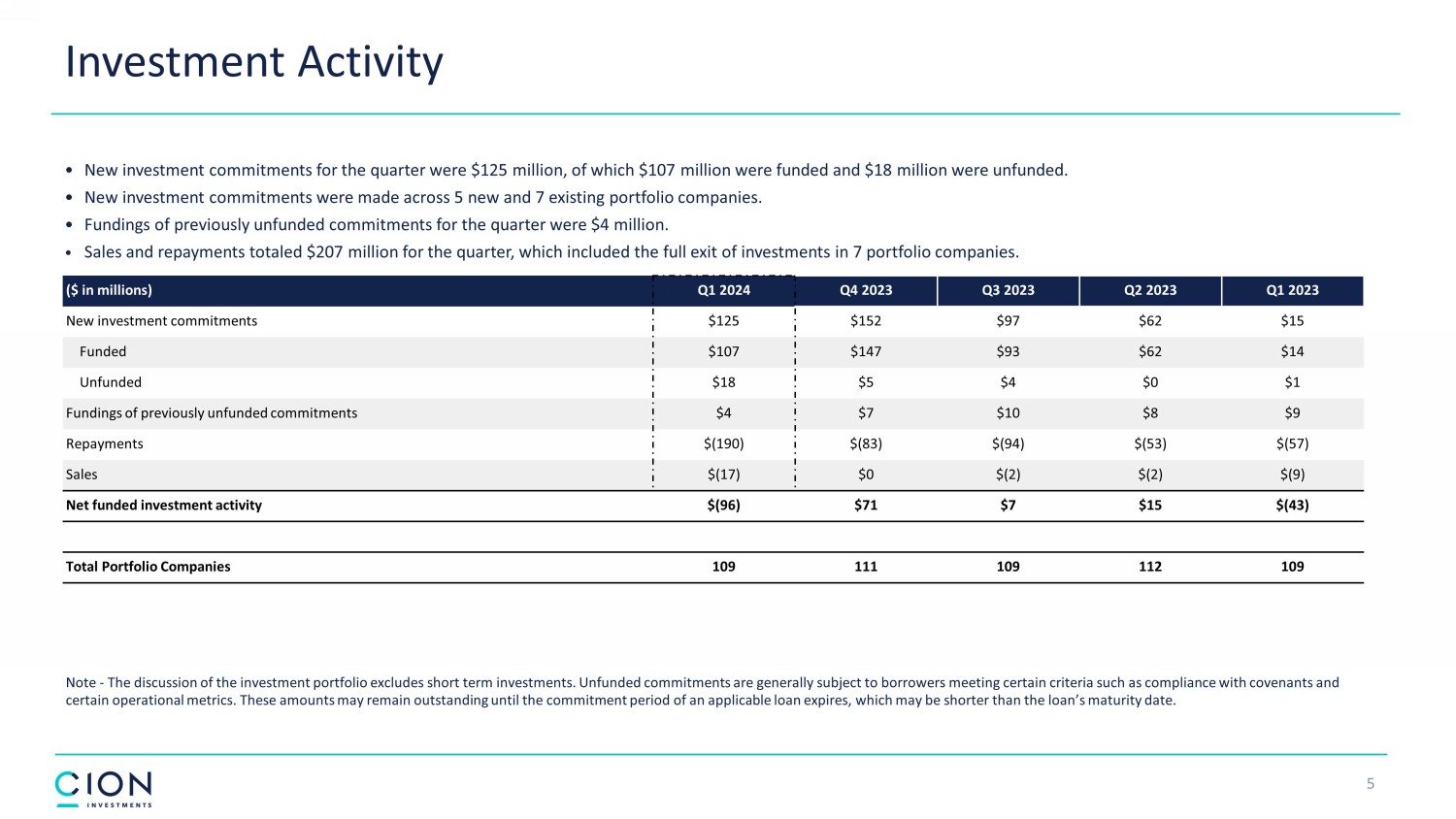 4 Selected Financial Highlights 1. The discussion of the investment portfolio excludes short term investments. 2. Total debt outstanding excludes netting of debt issuance costs. Please refer to page 10 for debt net of issuance costs. 3. Includes supplemental distributions of $ 0 . 05 per share during each quarter ended September 30 , 2023 and December 31 , 2023 and a special distribution of $ 0 . 15 per share during the quarter ended December 31 , 2023 . ($ in millions) Q1 2024 Q4 2023 Q3 2023 Q2 2023 Q1 2023 Investment portfolio, at fair value (1) $1,741 $1,841 $1,728 $1,688 $1,657 Total debt outstanding (2) $1,070 $1,092 $1,008 $986 $1,011 Net assets $863 $880 $861 $836 $830 Debt - to - equity 1.24x 1.24x 1.17x 1.18x 1.22x Net debt - to - equity 1.03x 1.10x 1.03x 1.04x 1.02x Total investment income $73.6 $60.0 $67.5 $58.5 $65.0 Net investment income $32.6 $21.8 $30.0 $23.4 $29.9 Net realized and unrealized (losses) gains $(26.1) $29.2 $17.5 $4.5 $(60.9) Net increase (decrease) in net assets resulting from operations $6.4 $51.0 $47.5 $27.9 $(31.0) Per Share Data Net asset value per share $16.05 $16.23 $15.80 $15.31 $15.11 Net investment income per share $0.60 $0.40 $0.55 $0.43 $0.54 Net realized and unrealized (losses) gains per share $(0.48) $0.54 $0.32 $0.08 $(1.10) Earnings per share $0.12 $0.94 $0.87 $0.51 $(0.56) Distributions declared per share (3) $0.34 $0.54 $0.39 $0.34 $0.34