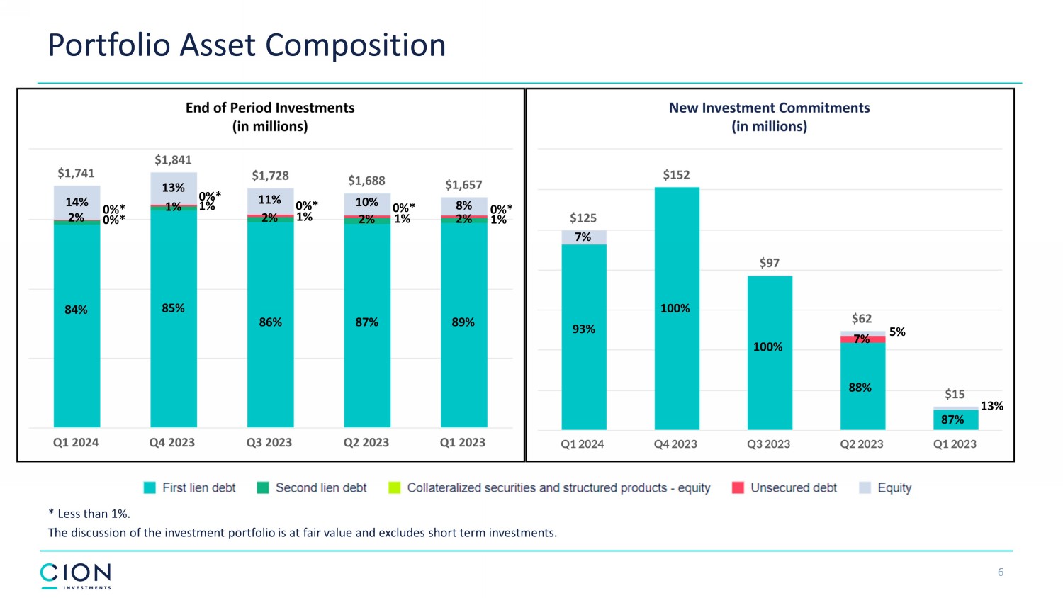 Investment Activity • New investment commitments for the quarter were $125 million, of which $107 million were funded and $18 million were unfunded . • New investment commitments were made across 5 new and 7 existing portfolio companies. • Fundings of previously unfunded commitments for the quarter were $4 million. • Sales and repayments totaled $207 million for the quarter, which included the full exit of investments in 7 portfolio companies. Note - The discussion of the investment portfolio excludes short term investments. Unfunded commitments are generally subject to bor row ers meeting certain criteria such as compliance with covenants and certain operational metrics. These amounts may remain outstanding until the commitment period of an applicable loan expires, which ma y b e shorter than the loan’s maturity date. 5 ($ in millions) Q1 2024 Q4 2023 Q3 2023 Q2 2023 Q1 2023 New investment commitments $125 $152 $97 $62 $15 Funded $107 $147 $93 $62 $14 Unfunded $18 $5 $4 $0 $1 Fundings of previously unfunded commitments $4 $7 $10 $8 $9 Repayments $(190) $(83) $(94) $(53) $(57) Sales $(17) $0 $(2) $(2) $(9) Net funded investment activity $(96) $71 $7 $15 $(43) Total Portfolio Companies 109 111 109 112 109
