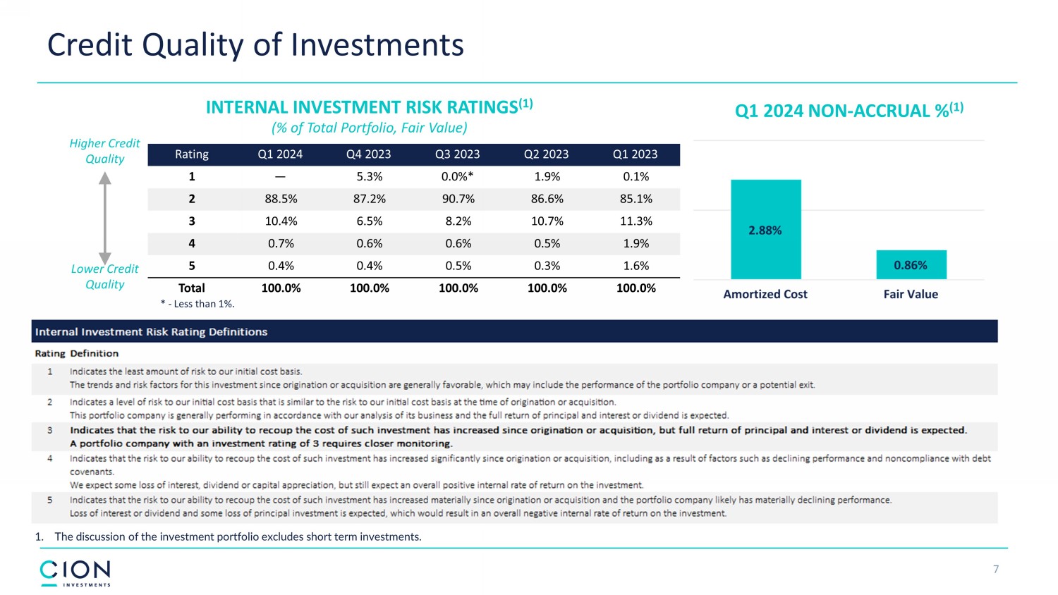 6 Portfolio Asset Composition * Less than 1%. The discussion of the investment portfolio is at fair value and excludes short term investments. 100% 100% 88% 7% 5% 87% 13% 84% 14% 2% 0%* 0%* 0%* 0%* 0%* 1% 1% 1% 1% 85% 1% 13% 86% 11% 2% 87% 89% 2% 10% 8% 2% 0%* 93% 7%