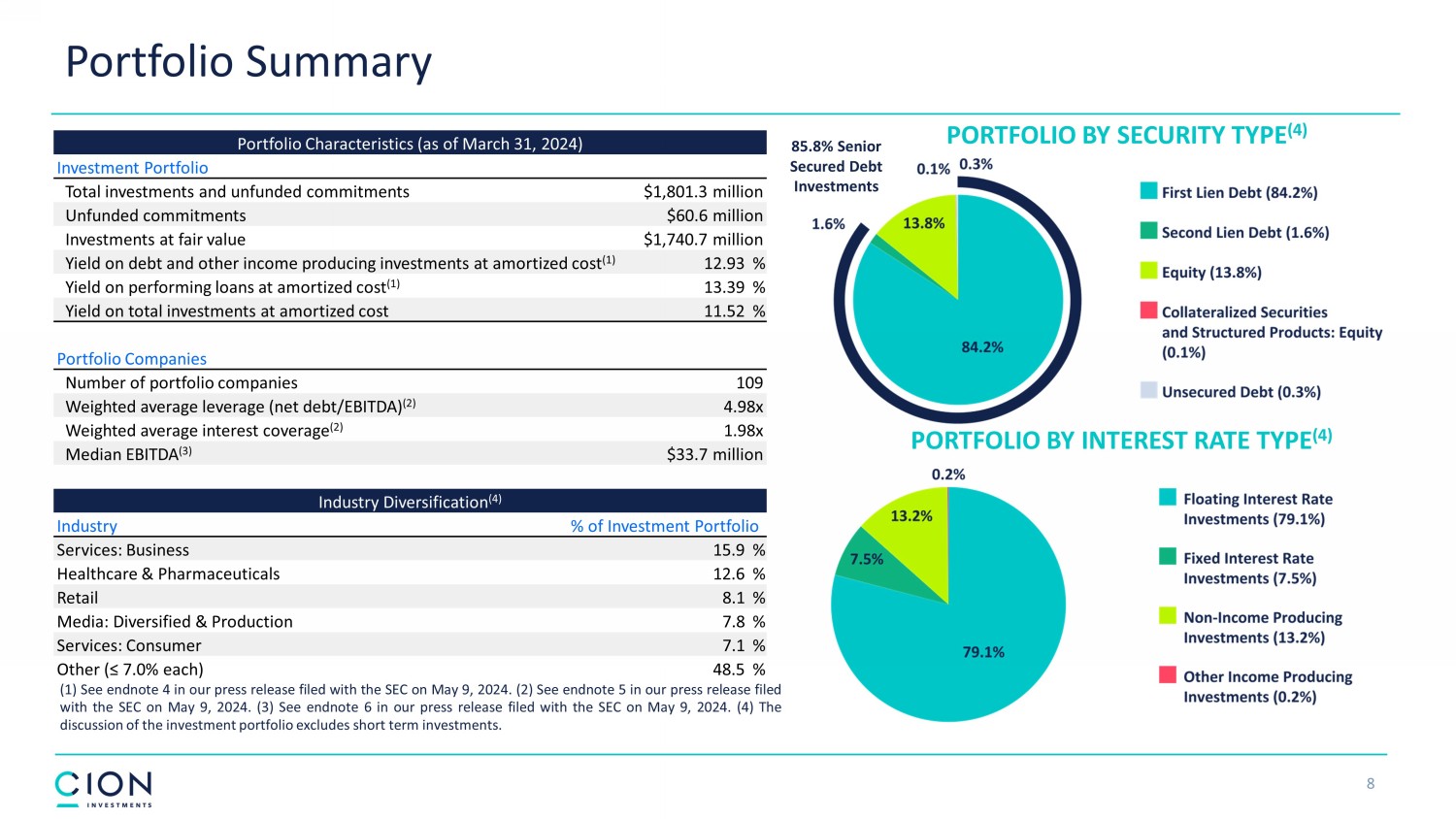 PORTFOLIO BY SECURITY TYPE (4) PORTFOLIO BY INTEREST RATE TYPE (4) Portfolio Summary 8 ( 1 ) See endnote 4 in our press release filed with the SEC on May 9 , 2024 . ( 2 ) See endnote 5 in our press release filed with the SEC on May 9 , 2024 . ( 3 ) See endnote 6 in our press release filed with the SEC on May 9 , 2024 . ( 4 ) The discussion of the investment portfolio excludes short term investments . Portfolio Characteristics (as of March 31, 2024) Investment Portfolio Total investments and unfunded commitments $1,801.3 million Unfunded commitments $60.6 million Investments at fair value $1,740.7 million Yield on debt and other income producing investments at amortized cost (1) 12.93 % Yield on performing loans at amortized cost (1) 13.39 % Yield on total investments at amortized cost 11.52 % Portfolio Companies Number of portfolio companies 109 Weighted average leverage (net debt/EBITDA) (2) 4.98x Weighted average interest coverage (2) 1.98x Median EBITDA (3) $33.7 million Industry Diversification (4) Industry % of Investment Portfolio Services: Business 15.9 % Healthcare & Pharmaceuticals 12.6 % Retail 8.1 % Media: Diversified & Production 7.8 % Services: Consumer 7.1 % Other (≤ 7.0% each) 48.5 % 85.8% Senior Secured Debt Investments
