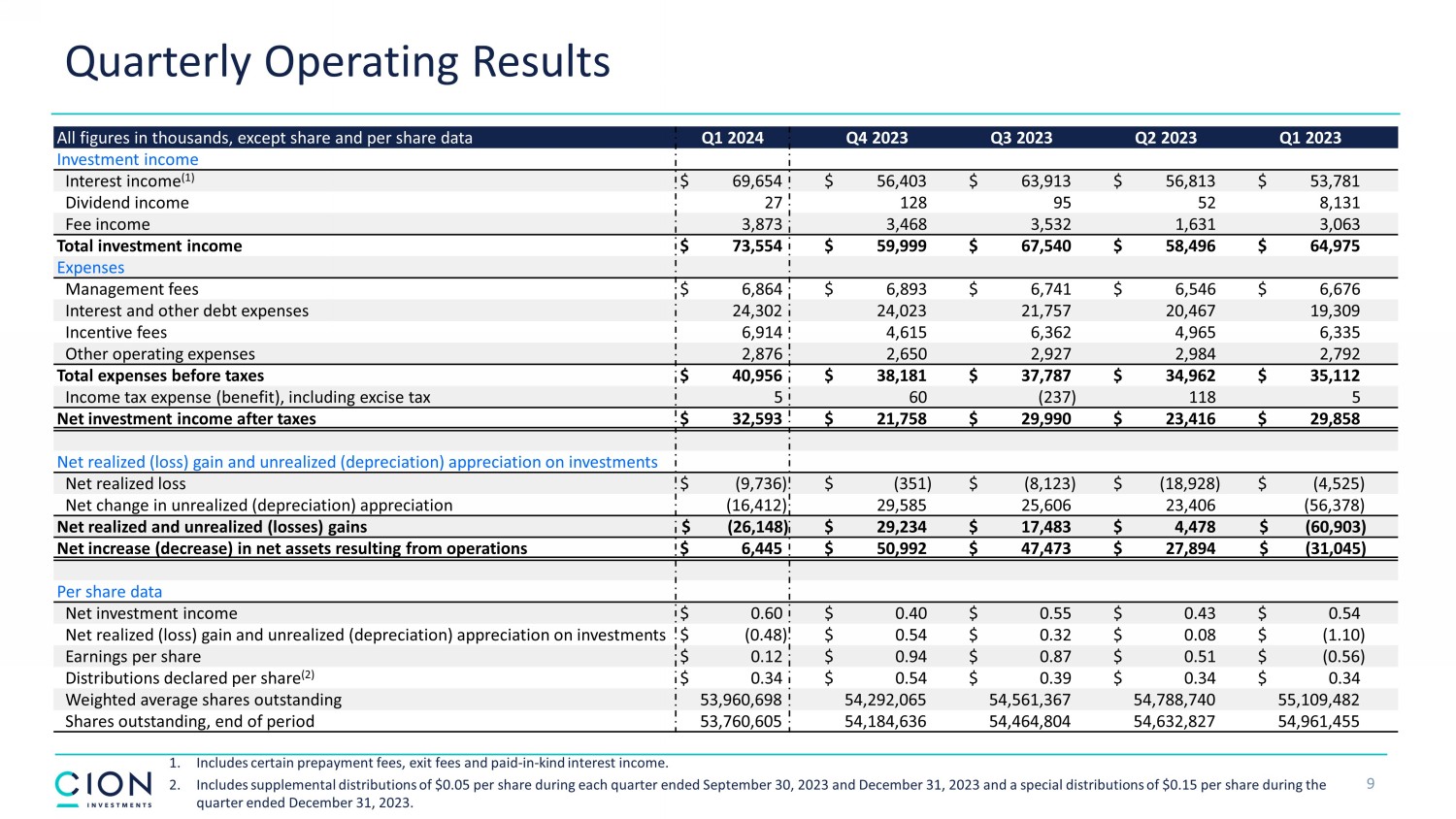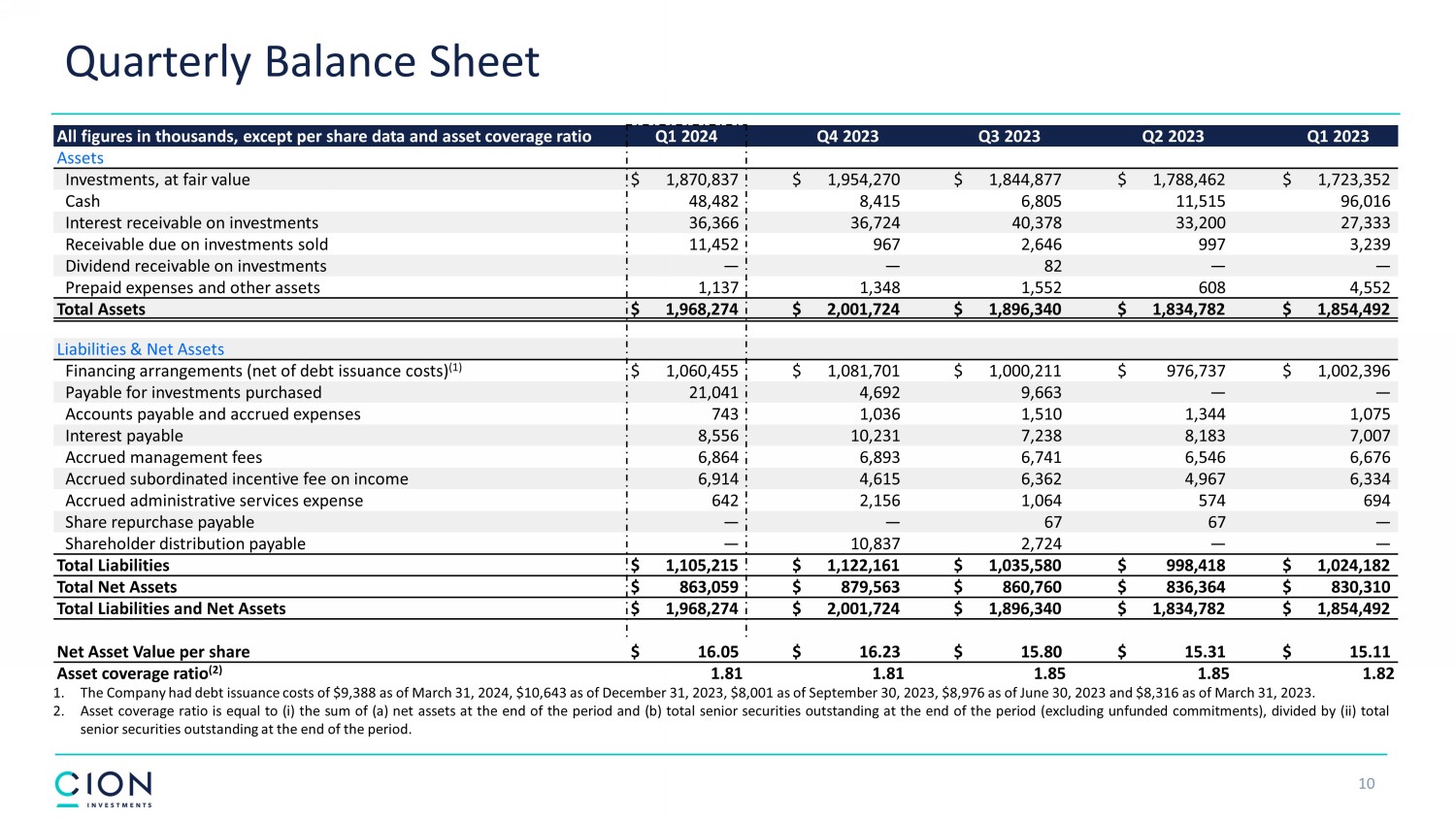 Quarterly Operating Results 9 All figures in thousands, except share and per share data Q1 2024 Q4 2023 Q3 2023 Q2 2023 Q1 2023 Investment income Interest income (1) $ 69,654 $ 56,403 $ 63,913 $ 56,813 $ 53,781 Dividend income 27 128 95 52 8,131 Fee income 3,873 3,468 3,532 1,631 3,063 Total investment income $ 73,554 $ 59,999 $ 67,540 $ 58,496 $ 64,975 Expenses Management fees $ 6,864 $ 6,893 $ 6,741 $ 6,546 $ 6,676 Interest and other debt expenses 24,302 24,023 21,757 20,467 19,309 Incentive fees 6,914 4,615 6,362 4,965 6,335 Other operating expenses 2,876 2,650 2,927 2,984 2,792 Total expenses before taxes $ 40,956 $ 38,181 $ 37,787 $ 34,962 $ 35,112 Income tax expense (benefit), including excise tax 5 60 (237) 118 5 Net investment income after taxes $ 32,593 $ 21,758 $ 29,990 $ 23,416 $ 29,858 Net realized (loss) gain and unrealized (depreciation) appreciation on investments Net realized loss $ (9,736) $ (351) $ (8,123) $ (18,928) $ (4,525) Net change in unrealized (depreciation) appreciation (16,412) 29,585 25,606 23,406 (56,378) Net realized and unrealized (losses) gains $ (26,148) $ 29,234 $ 17,483 $ 4,478 $ (60,903) Net increase (decrease) in net assets resulting from operations $ 6,445 $ 50,992 $ 47,473 $ 27,894 $ (31,045) Per share data Net investment income $ 0.60 $ 0.40 $ 0.55 $ 0.43 $ 0.54 Net realized (loss) gain and unrealized (depreciation) appreciation on investments $ (0.48) $ 0.54 $ 0.32 $ 0.08 $ (1.10) Earnings per share $ 0.12 $ 0.94 $ 0.87 $ 0.51 $ (0.56) Distributions declared per share (2) $ 0.34 $ 0.54 $ 0.39 $ 0.34 $ 0.34 Weighted average shares outstanding 53,960,698 54,292,065 54,561,367 54,788,740 55,109,482 Shares outstanding, end of period 53,760,605 54,184,636 54,464,804 54,632,827 54,961,455 1. Includes certain prepayment fees, exit fees and paid - in - kind interest income. 2. Includes supplemental distributions of $0.05 per share during each quarter ended September 30, 2023 and December 31, 2023 and a special distributions of $0.15 per share during the quarter ended December 31, 2023.