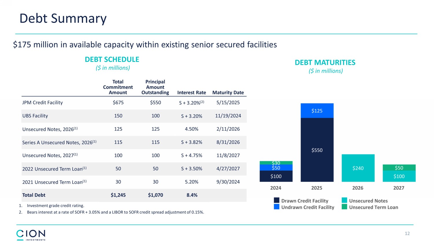 12 Total Commitment Amount Principal Amount Outstanding Interest Rate Maturity Date JPM Credit Facility $675 $550 S + 3.20% (2) 5/15/2025 UBS Facility 150 100 S + 3.20% 11/19/2024 Unsecured Notes, 2026 (1) 125 125 4.50% 2/11/2026 Series A Unsecured Notes, 2026 (1) 115 115 S + 3.82% 8/31/2026 Unsecured Notes, 2027 (1) 100 100 S + 4.75% 11/8/2027 2022 Unsecured Term Loan (1) 50 50 S + 3.50% 4/27/2027 2021 Unsecured Term Loan (1) 30 30 5.20% 9/30/2024 Total Debt $1,245 $1,070 8.4% Debt Summary DEBT MATURITIES ($ in millions) DEBT SCHEDULE ($ in millions) $175 million in available capacity within existing senior secured facilities 1. Investment grade credit rating. 2. Bears interest at a rate of SOFR + 3.05% and a LIBOR to SOFR credit spread adjustment of 0.15%.