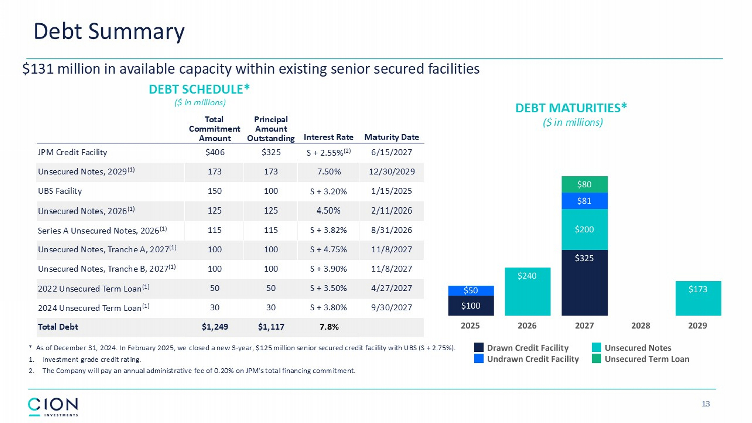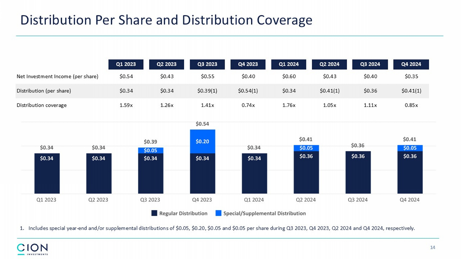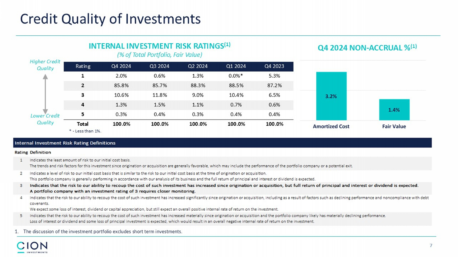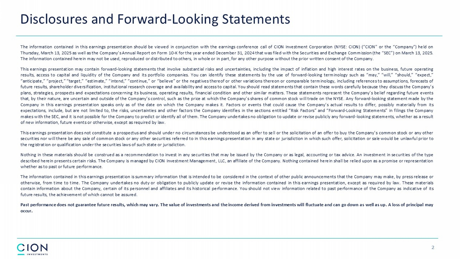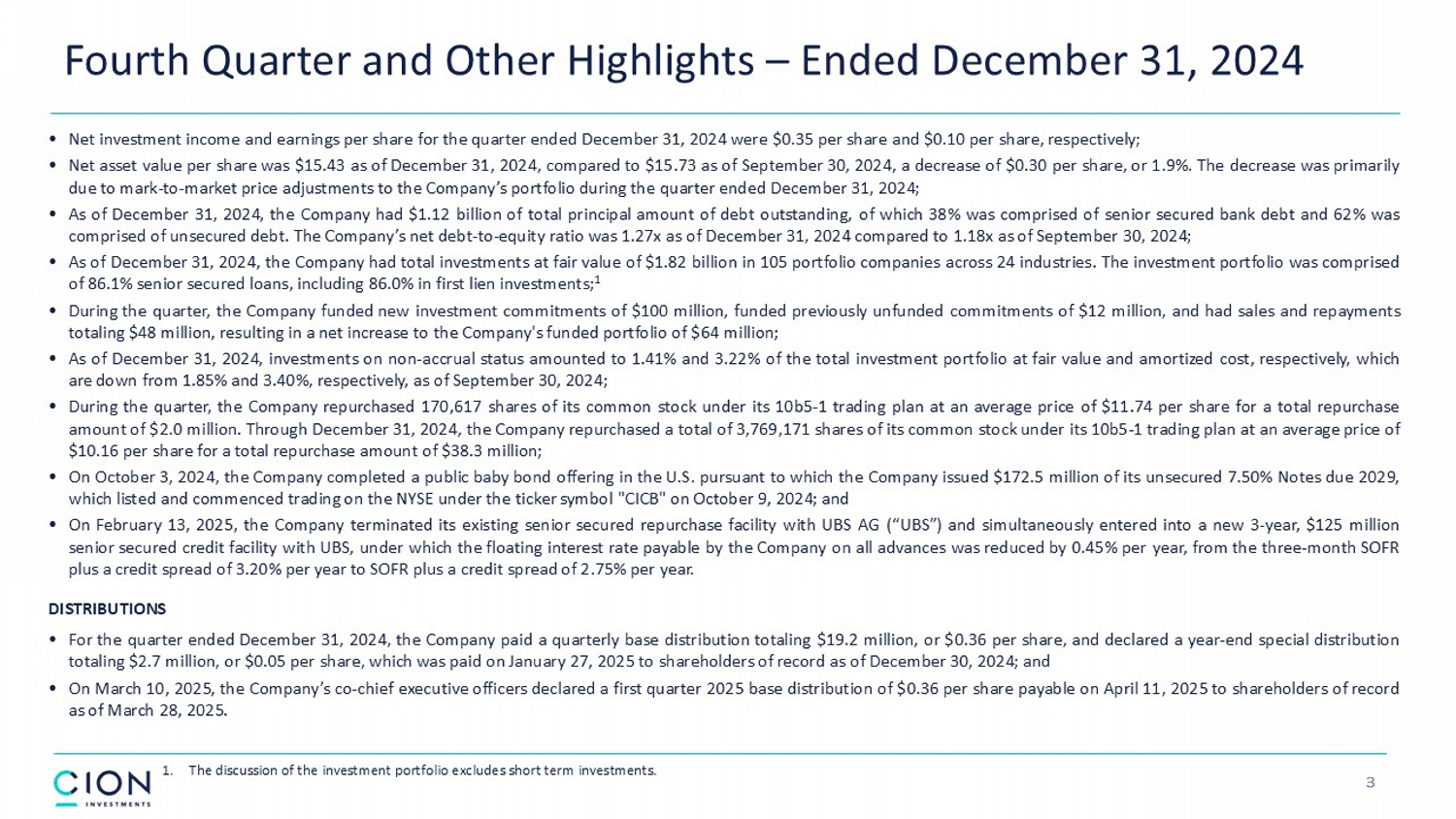 Disclosures and Forward - Looking Statements 2 The information contained in this earnings presentation should be viewed in conjunction with the earnings conference call of CION Investment Corporation (NYSE : CION) (“CION” or the “Company”) held on Thursday, March 13 , 2025 as well as the Company’s Annual Report on Form 10 - K for the year ended December 31 , 2024 that was filed with the Securities and Exchange Commission (the “SEC”) on March 13 , 2025 . The information contained herein may not be used, reproduced or distributed to others, in whole or in part, for any other purpose without the prior written consent of the Company . This earnings presentation may contain forward - looking statements that involve substantial risks and uncertainties, including the impact of inflation and high interest rates on the business, future operating results, access to capital and liquidity of the Company and its portfolio companies . You can identify these statements by the use of forward - looking terminology such as “may,” “will,” “should,” “expect,” “anticipate,” “project,” “target,” “estimate,” “intend,” “continue,” or “believe” or the negatives thereof or other variations thereon or comparable terminology, including references to assumptions, forecasts of future results, shareholder diversification, institutional research coverage and availability and access to capital . You should read statements that contain these words carefully because they discuss the Company’s plans, strategies, prospects and expectations concerning its business, operating results, financial condition and other similar matters . These statements represent the Company’s belief regarding future events that, by their nature, are uncertain and outside of the Company’s control, such as the price at which the Company’s shares of common stock will trade on the NYSE . Any forward - looking statement made by the Company in this earnings presentation speaks only as of the date on which the Company makes it . Factors or events that could cause the Company’s actual results to differ, possibly materially from its expectations, include, but are not limited to, the risks, uncertainties and other factors the Company identifies in the sections entitled “Risk Factors” and “Forward - Looking Statements” in filings the Company makes with the SEC, and it is not possible for the Company to predict or identify all of them . The Company undertakes no obligation to update or revise publicly any forward - looking statements, whether as a result of new information, future events or otherwise, except as required by law . This earnings presentation does not constitute a prospectus and should under no circumstances be understood as an offer to sell or the solicitation of an offer to buy the Company’s common stock or any other securities nor will there be any sale of common stock or any other securities referred to in this earnings presentation in any state or jurisdiction in which such offer, solicitation or sale would be unlawful prior to the registration or qualification under the securities laws of such state or jurisdiction . Nothing in these materials should be construed as a recommendation to invest in any securities that may be issued by the Company or as legal, accounting or tax advice . An investment in securities of the type described herein presents certain risks . The Company is managed by CION Investment Management, LLC, an affiliate of the Company . Nothing contained herein shall be relied upon as a promise or representation whether as to past or future performance . The information contained in this earnings presentation is summary information that is intended to be considered in the context of other public announcements that the Company may make, by press release or otherwise, from time to time . The Company undertakes no duty or obligation to publicly update or revise the information contained in this earnings presentation, except as required by law . These materials contain information about the Company, certain of its personnel and affiliates and its historical performance . You should not view information related to past performance of the Company as indicative of its future results, the achievement of which cannot be assured . Past performance does not guarantee future results, which may vary . The value of investments and the income derived from investments will fluctuate and can go down as well as up . A loss of principal may occur .