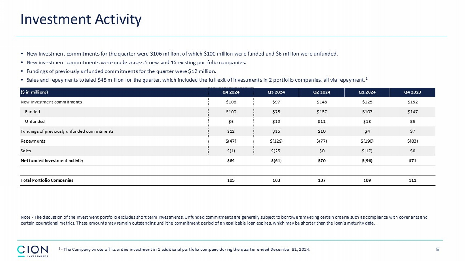 4 Selected Financial Highlights 1. The discussion of the investment portfolio excludes short term investments. 2. Total debt outstanding excludes netting of debt issuance costs. Please refer to page 11 for debt net of issuance costs. 3. Includes supplemental distributions of $ 0 . 05 per share during each quarter ended December 31 , 2023 and June 30 , 2024 and special year - end distributions of $ 0 . 15 per share and $ 0 . 05 per share during the quarters ended December 31 , 2023 and 2024 , respectively . Q4 2023 Q1 2024 Q2 2024 Q3 2024 Q4 2024 ($ in millions) $1,841 $1,741 $1,823 $1,753 $1,820 Investment portfolio, at fair value (1) $1,092 $1,070 $1,070 $1,070 $1,117 Total debt outstanding (2) $880 $863 $861 $839 $821 Net assets 1.24x 1.24x 1.24x 1.28x 1.36x Debt - to - equity 1.10x 1.03x 1.13x 1.18x 1.27x Net debt - to - equity $60.0 $73.6 $61.4 $59.6 $57.9 Total investment income $21.8 $32.6 $23.0 $21.6 $18.7 Net investment income $29.2 $(26.1) $(0.6) $(22.0) $(13.2) Net realized and unrealized (losses) gains $51.0 $6.4 $22.4 $(0.4) $5.5 Net increase (decrease) in net assets resulting from operations Per Share Data $16.23 $16.05 $16.08 $15.73 $15.43 Net asset value per share $0.40 $0.60 $0.43 $0.40 $0.35 Net investment income per share $0.54 $(0.48) $(0.01) $(0.41) $(0.25) Net realized and unrealized (losses) gains per share $0.94 $0.12 $0.42 $(0.01) $0.10 Earnings per share $0.54 $0.34 $0.41 $0.36 $0.41 Distributions declared per share (3)