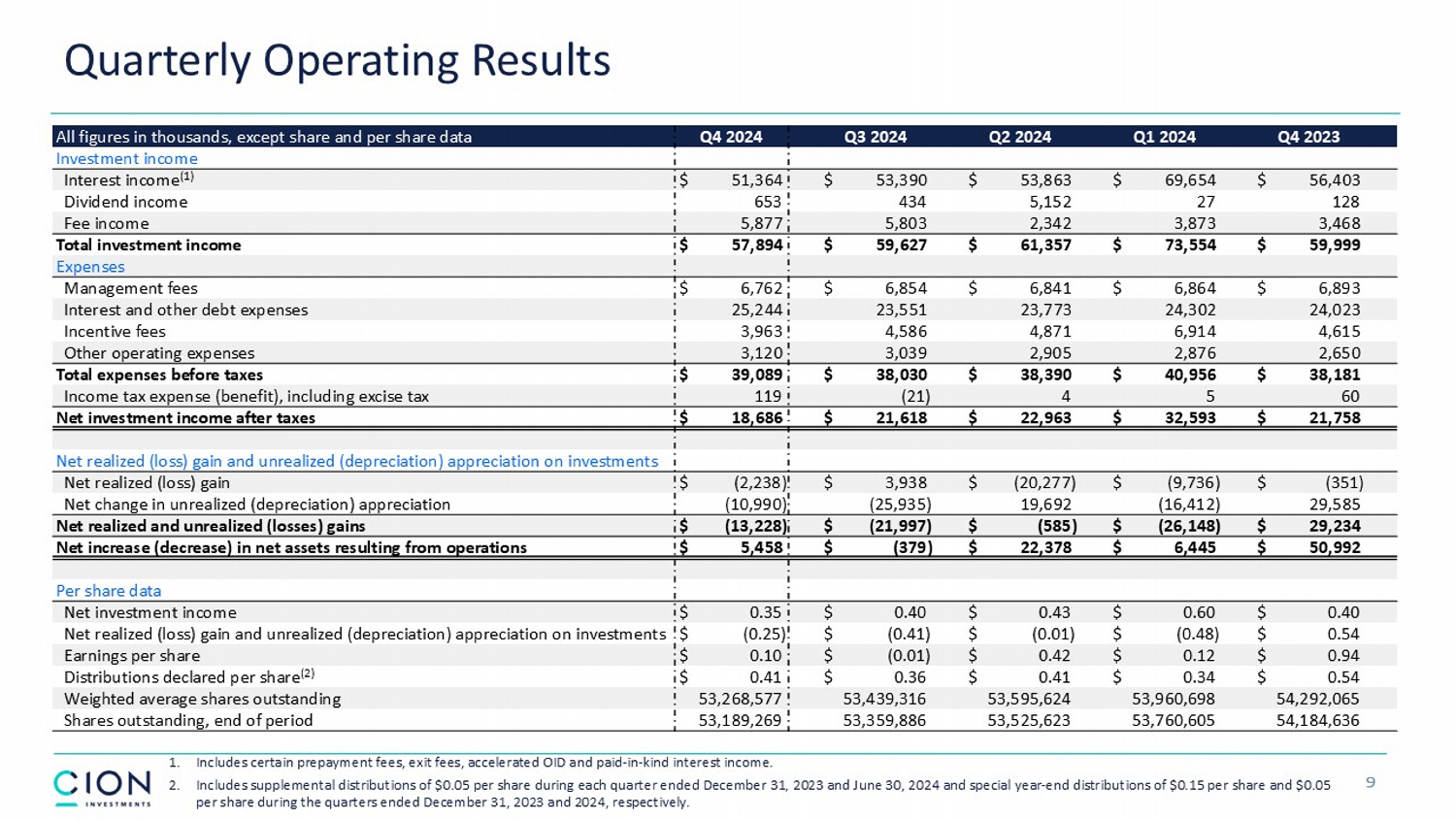 Quarterly Operating Results 9 Q4 2023 Q1 2024 Q2 2024 Q3 2024 Q4 2024 All figures in thousands, except share and per share data Investment income $ 56,403 $ 69,654 $ 53,863 $ 53,390 $ 51,364 Interest income (1) 128 27 5,152 434 653 Dividend income 3,468 3,873 2,342 5,803 5,877 Fee income $ 59,999 $ 73,554 $ 61,357 $ 59,627 $ 57,894 Total investment income Expenses $ 6,893 $ 6,864 $ 6,841 $ 6,854 $ 6,762 Management fees 24,023 24,302 23,773 23,551 25,244 Interest and other debt expenses 4,615 6,914 4,871 4,586 3,963 Incentive fees 2,650 2,876 2,905 3,039 3,120 Other operating expenses $ 38,181 $ 40,956 $ 38,390 $ 38,030 $ 39,089 Total expenses before taxes 60 5 4 (21) 119 Income tax expense (benefit), including excise tax $ 21,758 $ 32,593 $ 22,963 $ 21,618 $ 18,686 Net investment income after taxes Net realized (loss) gain and unrealized (depreciation) appreciation on investments $ (351) $ (9,736) $ (20,277) $ 3,938 $ (2,238) Net realized (loss) gain 29,585 (16,412) 19,692 (25,935) (10,990) Net change in unrealized (depreciation) appreciation $ 29,234 $ (26,148) $ (585) $ (21,997) $ (13,228) Net realized and unrealized (losses) gains $ 50,992 $ 6,445 $ 22,378 $ (379) $ 5,458 Net increase (decrease) in net assets resulting from operations Per share data $ 0.40 $ 0.60 $ 0.43 $ 0.40 $ 0.35 Net investment income $ 0.54 $ (0.48) $ (0.01) $ (0.41) $ (0.25) Net realized (loss) gain and unrealized (depreciation) appreciation on investments $ 0.94 $ 0.12 $ 0.42 $ (0.01) $ 0.10 Earnings per share $ 0.54 $ 0.34 $ 0.41 $ 0.36 $ 0.41 Distributions declared per share (2) 54,292,065 53,960,698 53,595,624 53,439,316 53,268,577 Weighted average shares outstanding 54,184,636 53,760,605 53,525,623 53,359,886 53,189,269 Shares outstanding, end of period 1. Includes certain prepayment fees, exit fees, accelerated OID and paid - in - kind interest income. 2. Includes supplemental distributions of $0.05 per share during each quarter ended December 31, 2023 and June 30, 2024 and spec ial year - end distributions of $0.15 per share and $0.05 per share during the quarters ended December 31, 2023 and 2024, respectively.