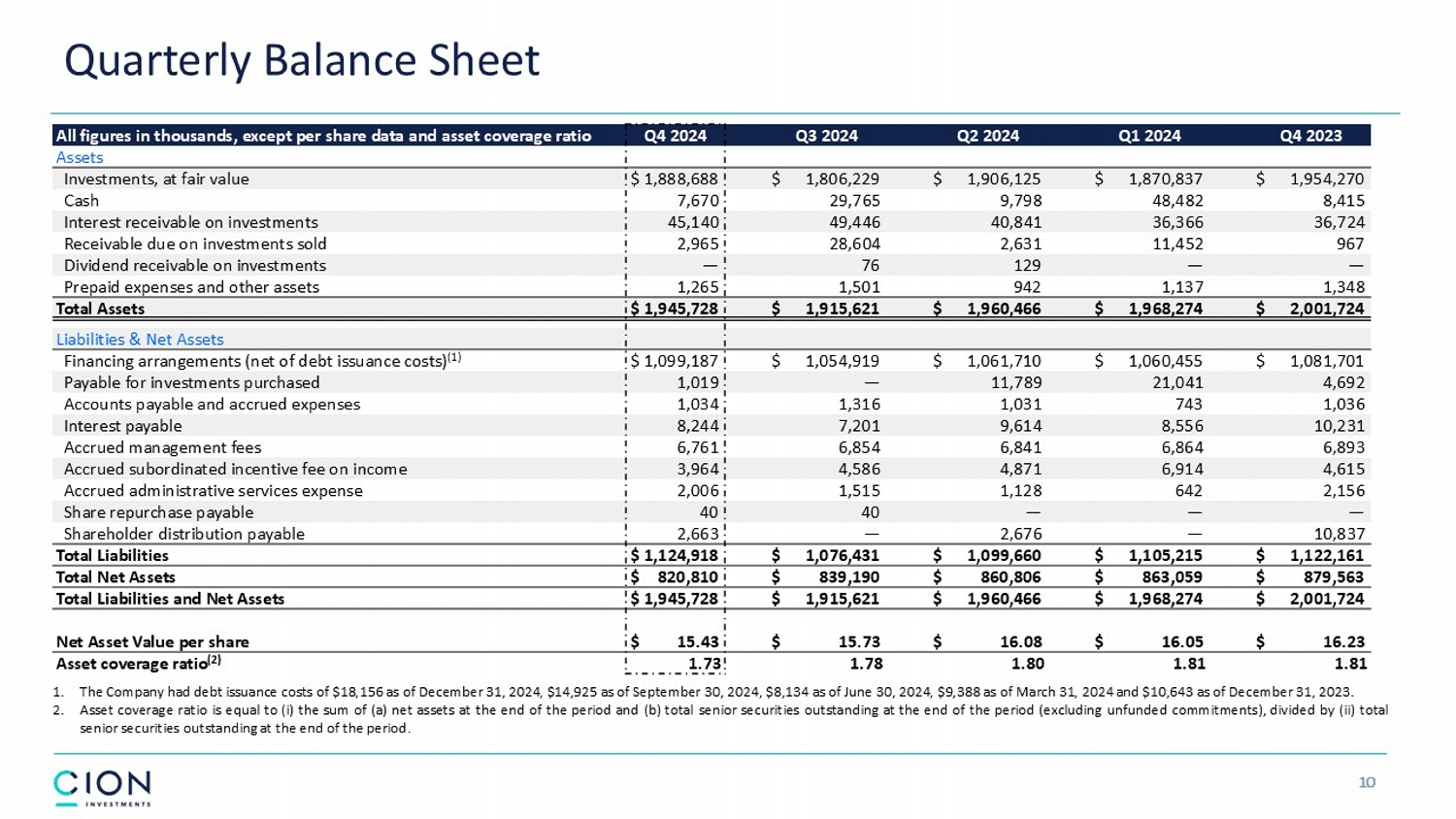 Quarterly Balance Sheet 10 Q4 2023 Q1 2024 Q2 2024 Q3 2024 Q4 2024 All figures in thousands, except per share data and asset coverage ratio Assets $ 1,954,270 $ 1,870,837 $ 1,906,125 $ 1,806,229 $ 1,888,688 Investments, at fair value 8,415 48,482 9,798 29,765 7,670 Cash 36,724 36,366 40,841 49,446 45,140 Interest receivable on investments 967 11,452 2,631 28,604 2,965 Receivable due on investments sold — — 129 76 — Dividend receivable on investments 1,348 1,137 942 1,501 1,265 Prepaid expenses and other assets $ 2,001,724 $ 1,968,274 $ 1,960,466 $ 1,915,621 $ 1,945,728 Total Assets Liabilities & Net Assets $ 1,081,701 $ 1,060,455 $ 1,061,710 $ 1,054,919 $ 1,099,187 Financing arrangements (net of debt issuance costs) (1) 4,692 21,041 11,789 — 1,019 Payable for investments purchased 1,036 743 1,031 1,316 1,034 Accounts payable and accrued expenses 10,231 8,556 9,614 7,201 8,244 Interest payable 6,893 6,864 6,841 6,854 6,761 Accrued management fees 4,615 6,914 4,871 4,586 3,964 Accrued subordinated incentive fee on income 2,156 642 1,128 1,515 2,006 Accrued administrative services expense — — — 40 40 Share repurchase payable 10,837 — 2,676 — 2,663 Shareholder distribution payable $ 1,122,161 $ 1,105,215 $ 1,099,660 $ 1,076,431 $ 1,124,918 Total Liabilities $ 879,563 $ 863,059 $ 860,806 $ 839,190 $ 820,810 Total Net Assets $ 2,001,724 $ 1,968,274 $ 1,960,466 $ 1,915,621 $ 1,945,728 Total Liabilities and Net Assets $ 16.23 $ 16.05 $ 16.08 $ 15.73 $ 15.43 Net Asset Value per share 1.81 1.81 1.80 1.78 1.73 Asset coverage ratio (2) 1. The Company had debt issuance costs of $ 18 , 156 as of December 31 , 2024 , $ 14 , 925 as of September 30 , 2024 , $ 8 , 134 as of June 30 , 2024 , $ 9 , 388 as of March 31 , 2024 and $ 10 , 643 as of December 31 , 2023 . 2. Asset coverage ratio is equal to (i) the sum of (a) net assets at the end of the period and (b) total senior securities outstanding at the end of the period (excluding unfunded commitments), divided by (ii) total senior securities outstanding at the end of the period .
