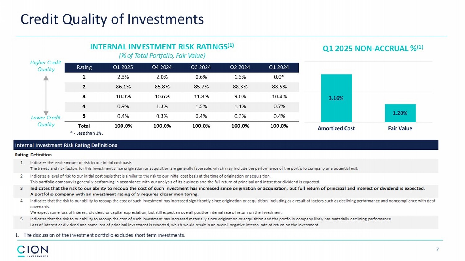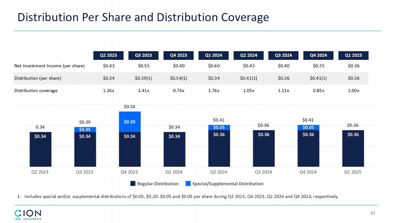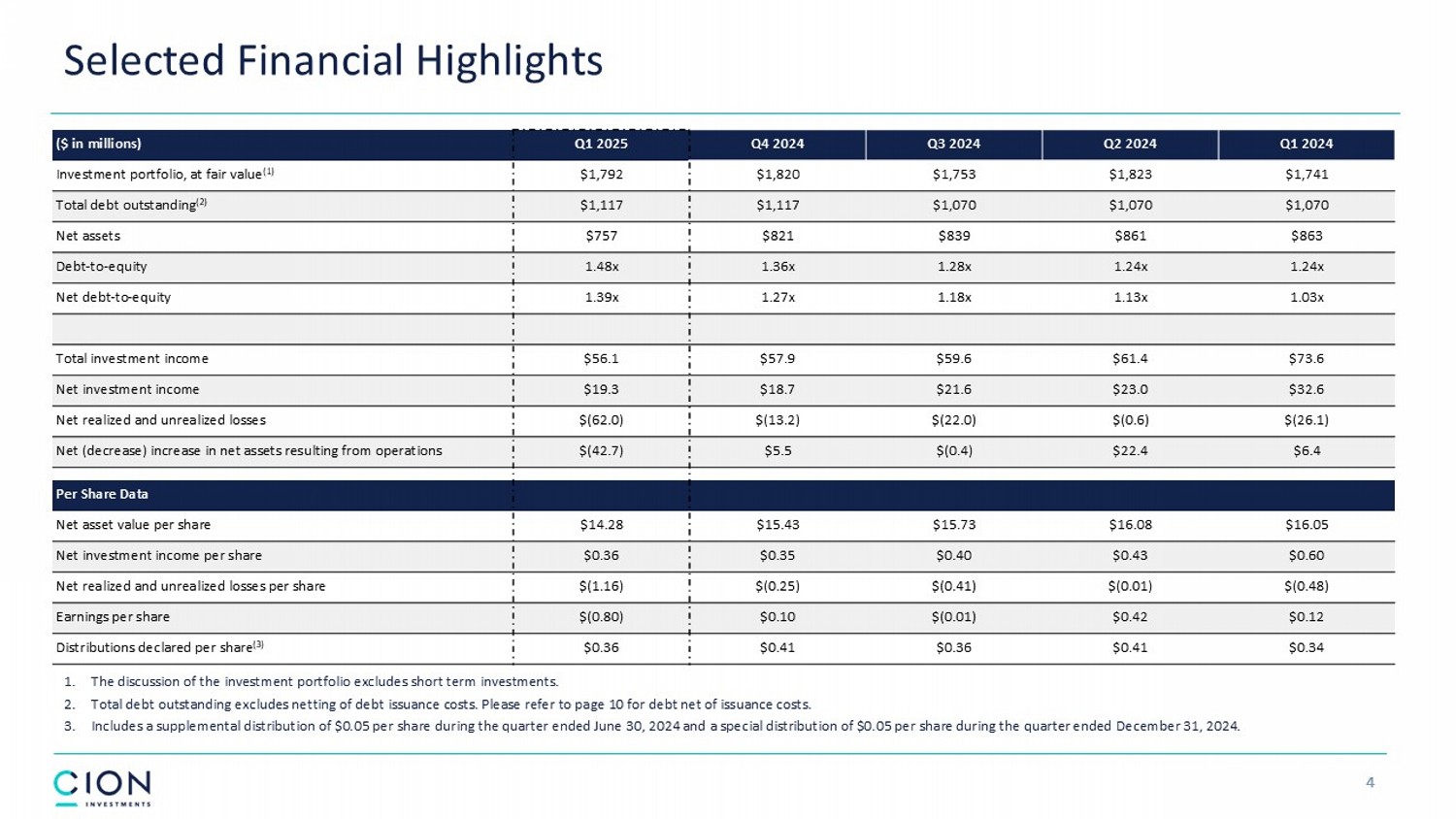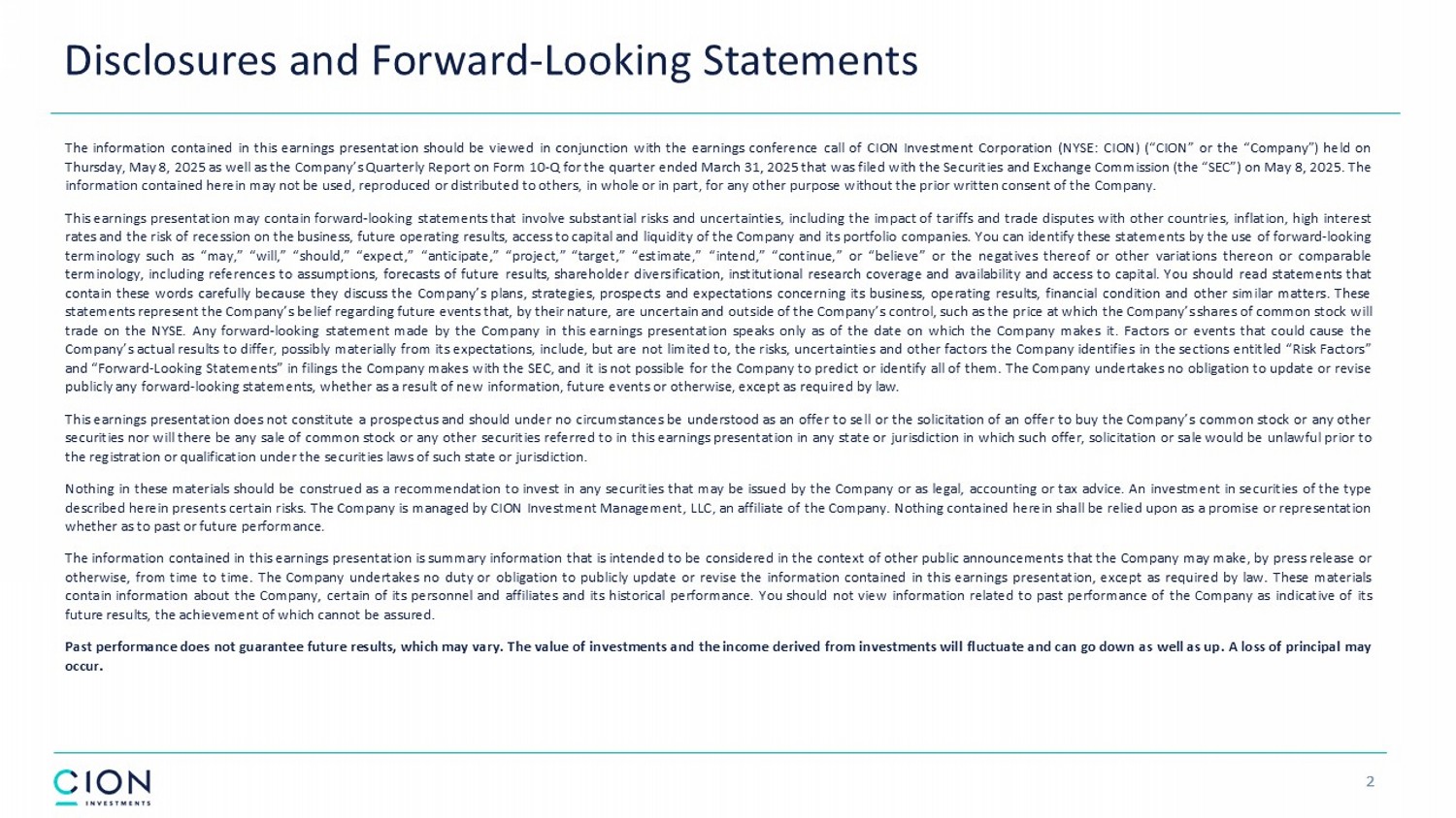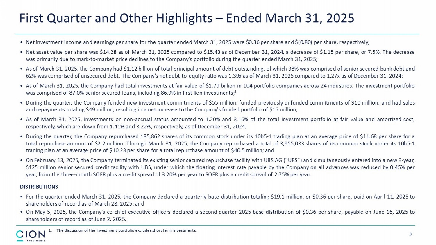 Disclosures and Forward - Looking Statements 2 The information contained in this earnings presentation should be viewed in conjunction with the earnings conference call of CION Investment Corporation (NYSE : CION) (“CION” or the “Company”) held on Thursday, May 8 , 2025 as well as the Company’s Quarterly Report on Form 10 - Q for the quarter ended March 31 , 2025 that was filed with the Securities and Exchange Commission (the “SEC”) on May 8 , 2025 . The information contained herein may not be used, reproduced or distributed to others, in whole or in part, for any other purpose without the prior written consent of the Company . This earnings presentation may contain forward - looking statements that involve substantial risks and uncertainties, including the impact of tariffs and trade disputes with other countries, inflation, high interest rates and the risk of recession on the business, future operating results, access to capital and liquidity of the Company and its portfolio companies . You can identify these statements by the use of forward - looking terminology such as “may,” “will,” “should,” “expect,” “anticipate,” “project,” “target,” “estimate,” “intend,” “continue,” or “believe” or the negatives thereof or other variations thereon or comparable terminology, including references to assumptions, forecasts of future results, shareholder diversification, institutional research coverage and availability and access to capital . You should read statements that contain these words carefully because they discuss the Company’s plans, strategies, prospects and expectations concerning its business, operating results, financial condition and other similar matters . These statements represent the Company’s belief regarding future events that, by their nature, are uncertain and outside of the Company’s control, such as the price at which the Company’s shares of common stock will trade on the NYSE . Any forward - looking statement made by the Company in this earnings presentation speaks only as of the date on which the Company makes it . Factors or events that could cause the Company’s actual results to differ, possibly materially from its expectations, include, but are not limited to, the risks, uncertainties and other factors the Company identifies in the sections entitled “Risk Factors” and “Forward - Looking Statements” in filings the Company makes with the SEC, and it is not possible for the Company to predict or identify all of them . The Company undertakes no obligation to update or revise publicly any forward - looking statements, whether as a result of new information, future events or otherwise, except as required by law . This earnings presentation does not constitute a prospectus and should under no circumstances be understood as an offer to sell or the solicitation of an offer to buy the Company’s common stock or any other securities nor will there be any sale of common stock or any other securities referred to in this earnings presentation in any state or jurisdiction in which such offer, solicitation or sale would be unlawful prior to the registration or qualification under the securities laws of such state or jurisdiction . Nothing in these materials should be construed as a recommendation to invest in any securities that may be issued by the Company or as legal, accounting or tax advice . An investment in securities of the type described herein presents certain risks . The Company is managed by CION Investment Management, LLC, an affiliate of the Company . Nothing contained herein shall be relied upon as a promise or representation whether as to past or future performance . The information contained in this earnings presentation is summary information that is intended to be considered in the context of other public announcements that the Company may make, by press release or otherwise, from time to time . The Company undertakes no duty or obligation to publicly update or revise the information contained in this earnings presentation, except as required by law . These materials contain information about the Company, certain of its personnel and affiliates and its historical performance . You should not view information related to past performance of the Company as indicative of its future results, the achievement of which cannot be assured . Past performance does not guarantee future results, which may vary . The value of investments and the income derived from investments will fluctuate and can go down as well as up . A loss of principal may occur .