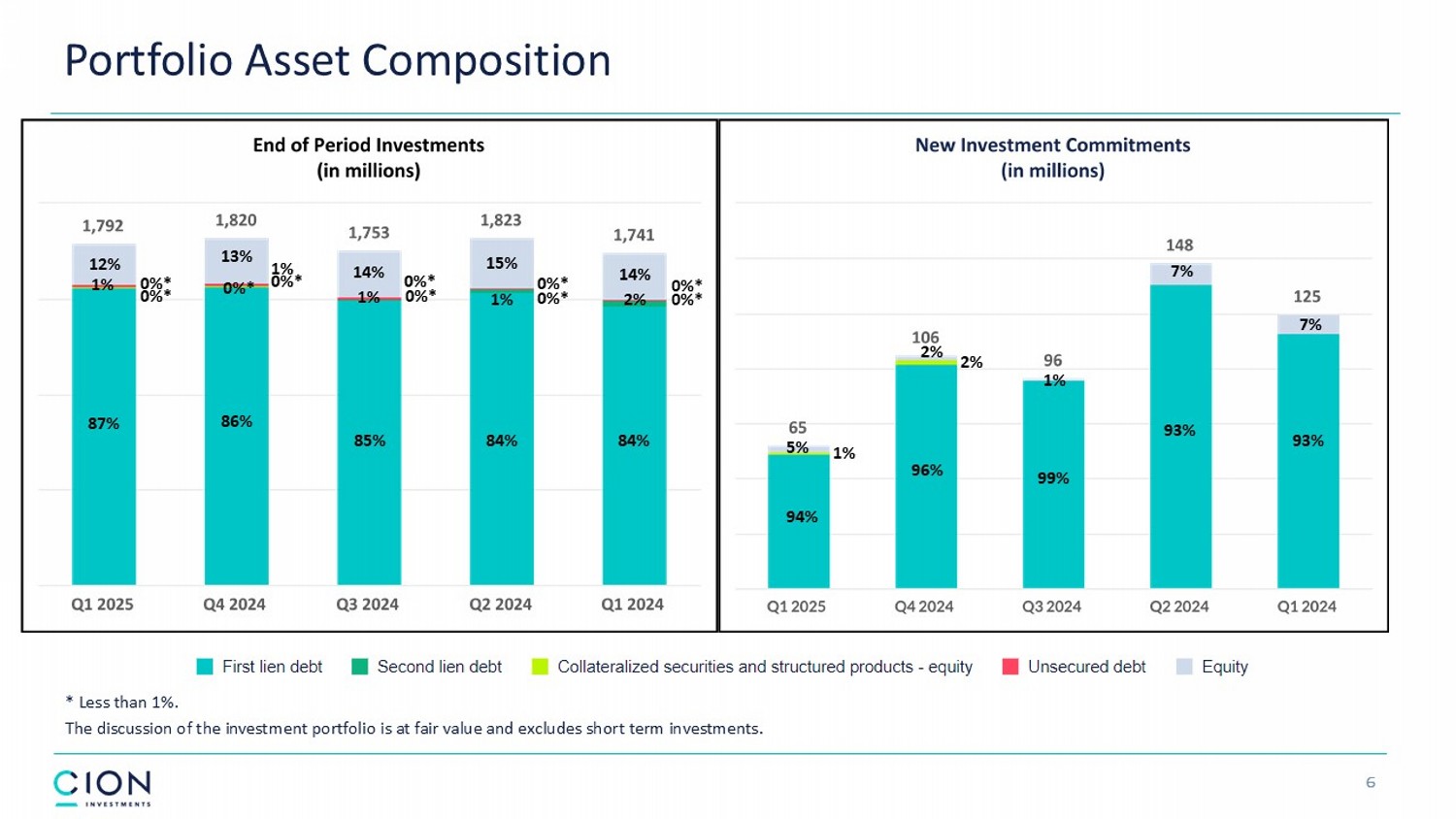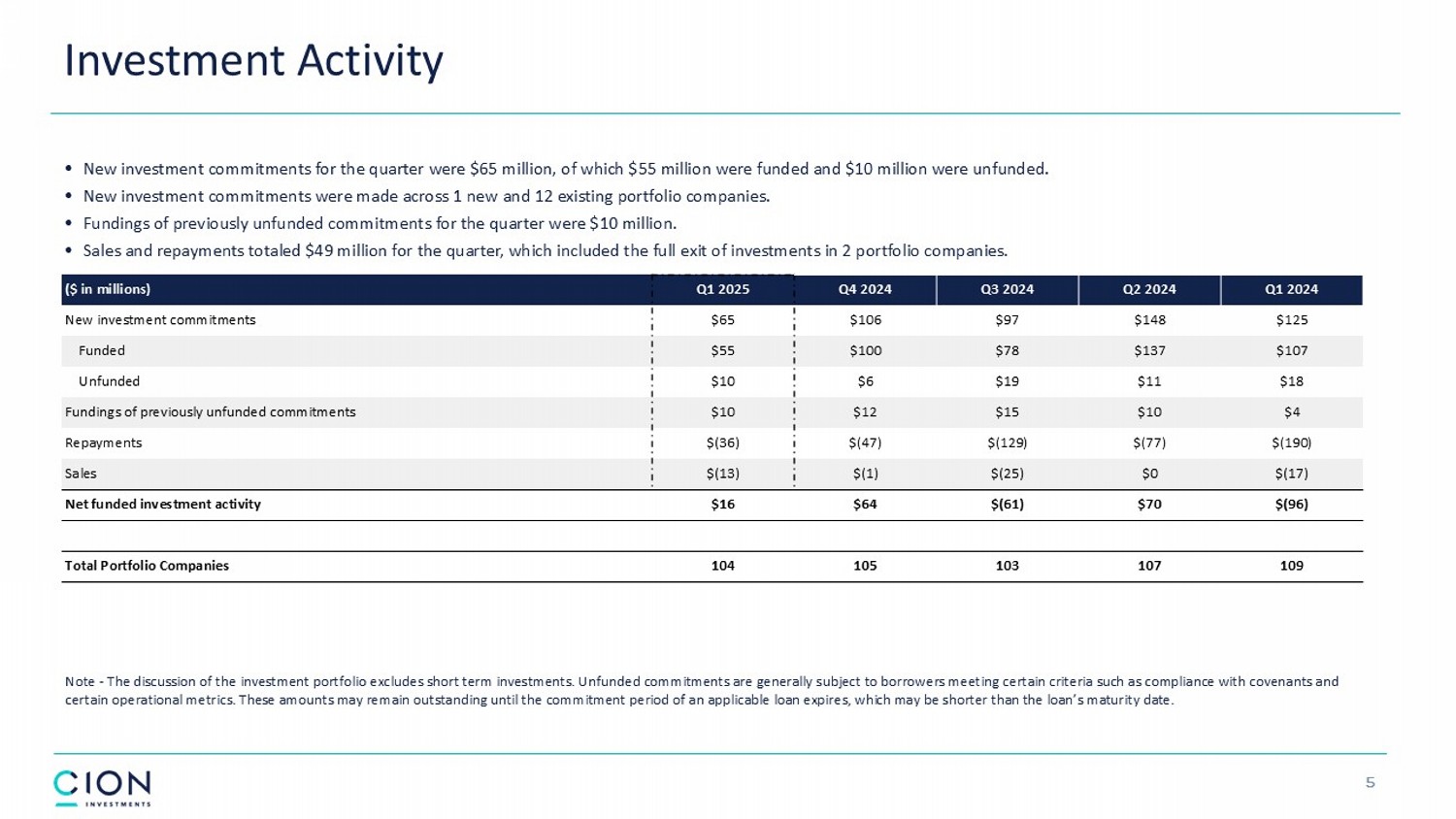 4 Selected Financial Highlights 1. The discussion of the investment portfolio excludes short term investments. 2. Total debt outstanding excludes netting of debt issuance costs. Please refer to page 10 for debt net of issuance costs. 3. Includes a supplemental distribution of $ 0 . 05 per share during the quarter ended June 30 , 2024 and a special distribution of $ 0 . 05 per share during the quarter ended December 31 , 2024 . Q1 2024 Q2 2024 Q3 2024 Q4 2024 Q1 2025 ($ in millions) $1,741 $1,823 $1,753 $1,820 $1,792 Investment portfolio, at fair value (1) $1,070 $1,070 $1,070 $1,117 $1,117 Total debt outstanding (2) $863 $861 $839 $821 $757 Net assets 1.24x 1.24x 1.28x 1.36x 1.48x Debt - to - equity 1.03x 1.13x 1.18x 1.27x 1.39x Net debt - to - equity $73.6 $61.4 $59.6 $57.9 $56.1 Total investment income $32.6 $23.0 $21.6 $18.7 $19.3 Net investment income $(26.1) $(0.6) $(22.0) $(13.2) $(62.0) Net realized and unrealized losses $6.4 $22.4 $(0.4) $5.5 $(42.7) Net (decrease) increase in net assets resulting from operations Per Share Data $16.05 $16.08 $15.73 $15.43 $14.28 Net asset value per share $0.60 $0.43 $0.40 $0.35 $0.36 Net investment income per share $(0.48) $(0.01) $(0.41) $(0.25) $(1.16) Net realized and unrealized losses per share $0.12 $0.42 $(0.01) $0.10 $(0.80) Earnings per share $0.34 $0.41 $0.36 $0.41 $0.36 Distributions declared per share (3)
