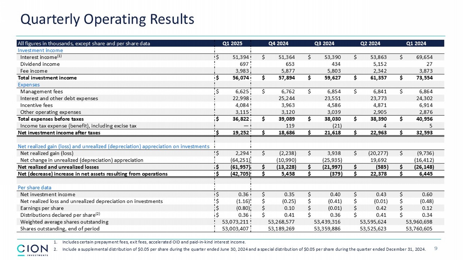Quarterly Operating Results 9 Q1 2024 Q2 2024 Q3 2024 Q4 2024 Q1 2025 All figures in thousands, except share and per share data Investment income $ 69,654 $ 53,863 $ 53,390 $ 51,364 $ 51,394 Interest income (1) 27 5,152 434 653 697 Dividend income 3,873 2,342 5,803 5,877 3,983 Fee income $ 73,554 $ 61,357 $ 59,627 $ 57,894 $ 56,074 Total investment income Expenses $ 6,864 $ 6,841 $ 6,854 $ 6,762 $ 6,625 Management fees 24,302 23,773 23,551 25,244 22,998 Interest and other debt expenses 6,914 4,871 4,586 3,963 4,084 Incentive fees 2,876 2,905 3,039 3,120 3,115 Other operating expenses $ 40,956 $ 38,390 $ 38,030 $ 39,089 $ 36,822 Total expenses before taxes 5 4 (21) 119 — Income tax expense (benefit), including excise tax $ 32,593 $ 22,963 $ 21,618 $ 18,686 $ 19,252 Net investment income after taxes Net realized gain (loss) and unrealized (depreciation) appreciation on investments $ (9,736) $ (20,277) $ 3,938 $ (2,238) $ 2,294 Net realized gain (loss) (16,412) 19,692 (25,935) (10,990) (64,251) Net change in unrealized (depreciation) appreciation $ (26,148) $ (585) $ (21,997) $ (13,228) $ (61,957) Net realized and unrealized losses $ 6,445 $ 22,378 $ (379) $ 5,458 $ (42,705) Net (decrease) increase in net assets resulting from operations Per share data $ 0.60 $ 0.43 $ 0.40 $ 0.35 $ 0.36 Net investment income $ (0.48) $ (0.01) $ (0.41) $ (0.25) $ (1.16) Net realized loss and unrealized depreciation on investments $ 0.12 $ 0.42 $ (0.01) $ 0.10 $ (0.80) Earnings per share $ 0.34 $ 0.41 $ 0.36 $ 0.41 $ 0.36 Distributions declared per share (2) 53,960,698 53,595,624 53,439,316 53,268,577 53,073,211 Weighted average shares outstanding 53,760,605 53,525,623 53,359,886 53,189,269 53,003,407 Shares outstanding, end of period 1. Includes certain prepayment fees, exit fees, accelerated OID and paid - in - kind interest income. 2. Include a supplemental distribution of $0.05 per share during the quarter ended June 30, 2024 and a special distribution of $ 0.0 5 per share during the quarter ended December 31, 2024.