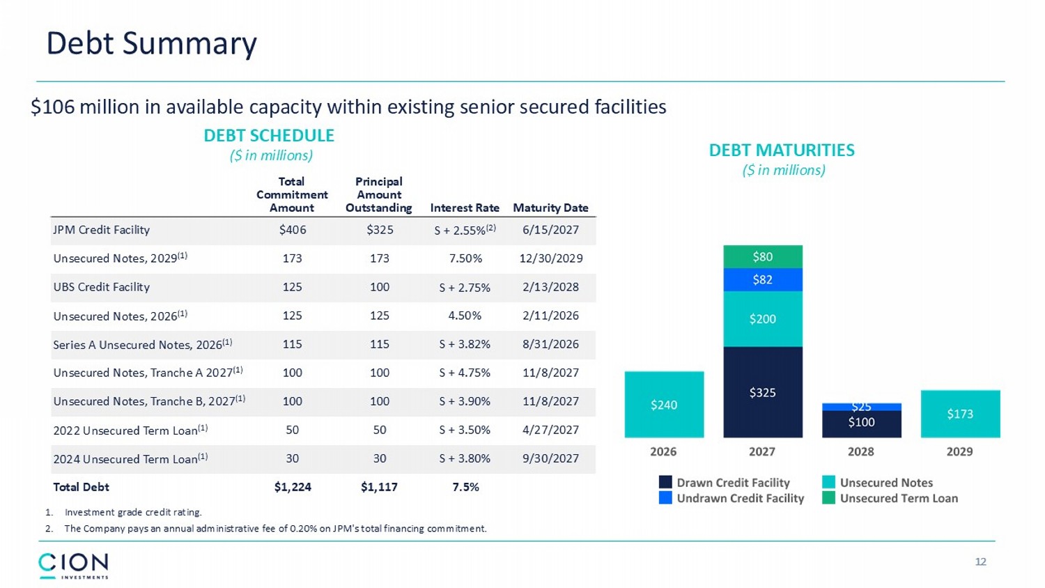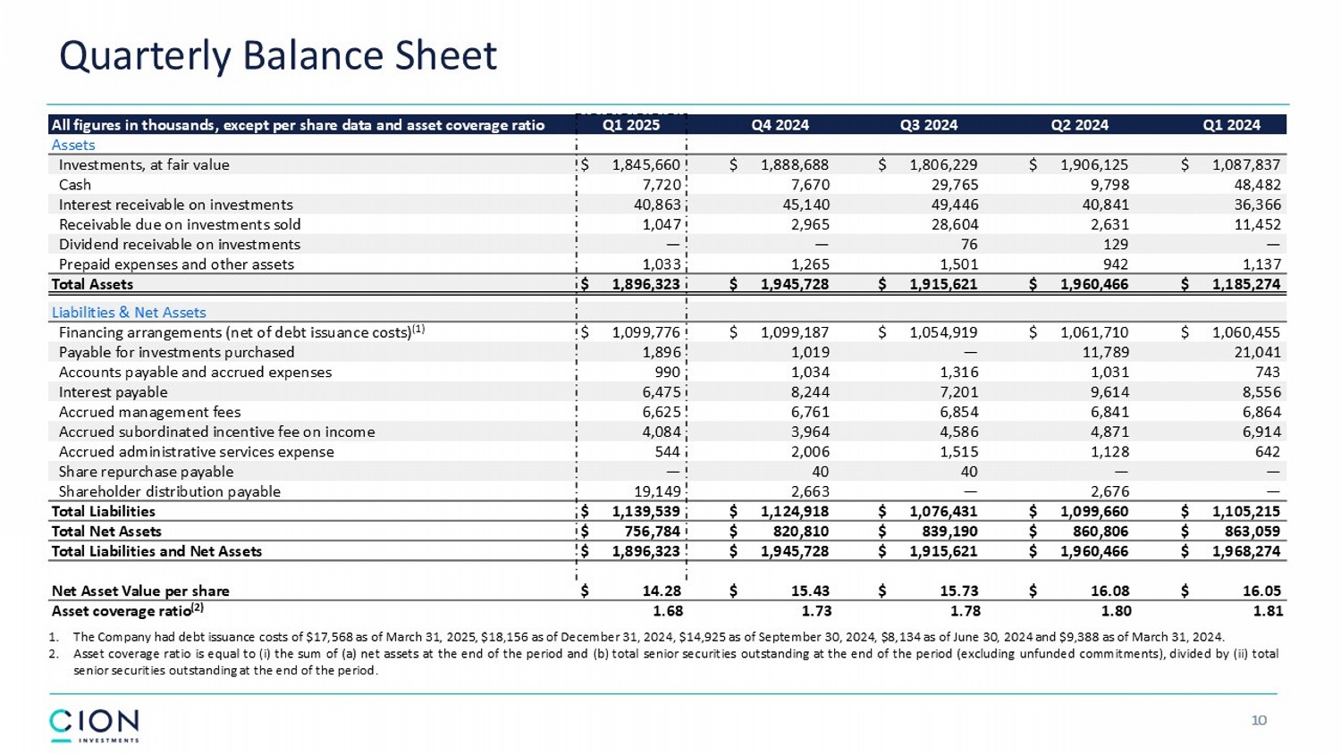 Quarterly Balance Sheet 10 Q1 2024 Q2 2024 Q3 2024 Q4 2024 Q1 2025 All figures in thousands, except per share data and asset coverage ratio Assets $ 1,087,837 $ 1,906,125 $ 1,806,229 $ 1,888,688 $ 1,845,660 Investments, at fair value 48,482 9,798 29,765 7,670 7,720 Cash 36,366 40,841 49,446 45,140 40,863 Interest receivable on investments 11,452 2,631 28,604 2,965 1,047 Receivable due on investments sold — 129 76 — — Dividend receivable on investments 1,137 942 1,501 1,265 1,033 Prepaid expenses and other assets $ 1,185,274 $ 1,960,466 $ 1,915,621 $ 1,945,728 $ 1,896,323 Total Assets Liabilities & Net Assets $ 1,060,455 $ 1,061,710 $ 1,054,919 $ 1,099,187 $ 1,099,776 Financing arrangements (net of debt issuance costs) (1) 21,041 11,789 — 1,019 1,896 Payable for investments purchased 743 1,031 1,316 1,034 990 Accounts payable and accrued expenses 8,556 9,614 7,201 8,244 6,475 Interest payable 6,864 6,841 6,854 6,761 6,625 Accrued management fees 6,914 4,871 4,586 3,964 4,084 Accrued subordinated incentive fee on income 642 1,128 1,515 2,006 544 Accrued administrative services expense — — 40 40 — Share repurchase payable — 2,676 — 2,663 19,149 Shareholder distribution payable $ 1,105,215 $ 1,099,660 $ 1,076,431 $ 1,124,918 $ 1,139,539 Total Liabilities $ 863,059 $ 860,806 $ 839,190 $ 820,810 $ 756,784 Total Net Assets $ 1,968,274 $ 1,960,466 $ 1,915,621 $ 1,945,728 $ 1,896,323 Total Liabilities and Net Assets $ 16.05 $ 16.08 $ 15.73 $ 15.43 $ 14.28 Net Asset Value per share 1.81 1.80 1.78 1.73 1.68 Asset coverage ratio (2) 1. The Company had debt issuance costs of $ 17 , 568 as of March 31 , 2025 , $ 18 , 156 as of December 31 , 2024 , $ 14 , 925 as of September 30 , 2024 , $ 8 , 134 as of June 30 , 2024 and $ 9 , 388 as of March 31 , 2024 . 2. Asset coverage ratio is equal to (i) the sum of (a) net assets at the end of the period and (b) total senior securities outstanding at the end of the period (excluding unfunded commitments), divided by (ii) total senior securities outstanding at the end of the period .