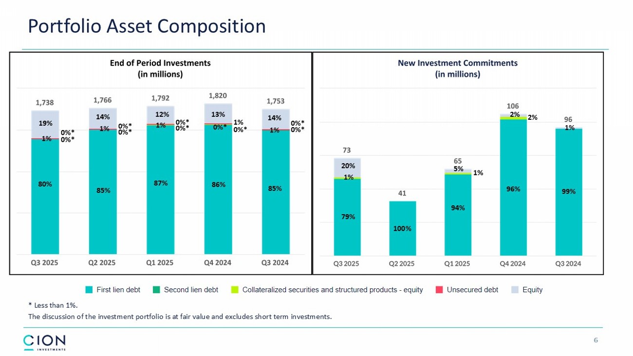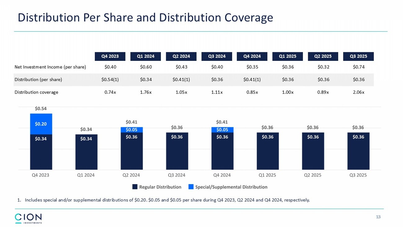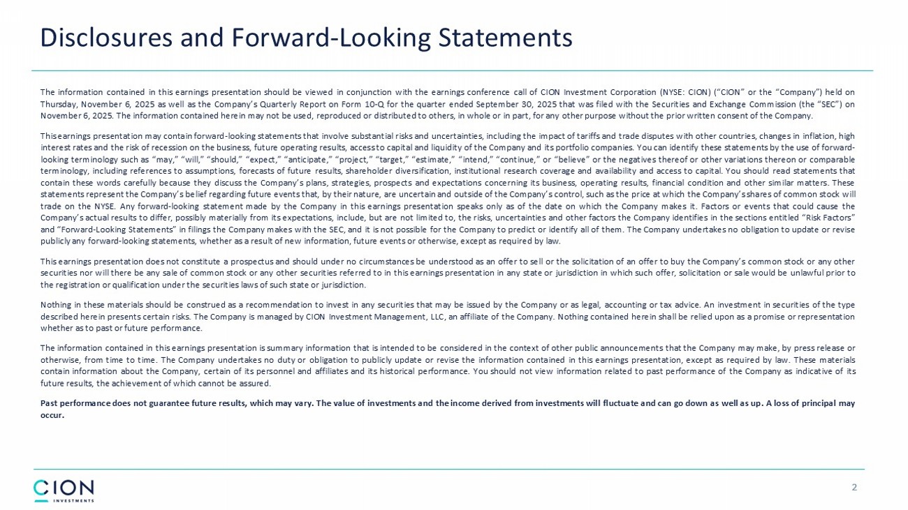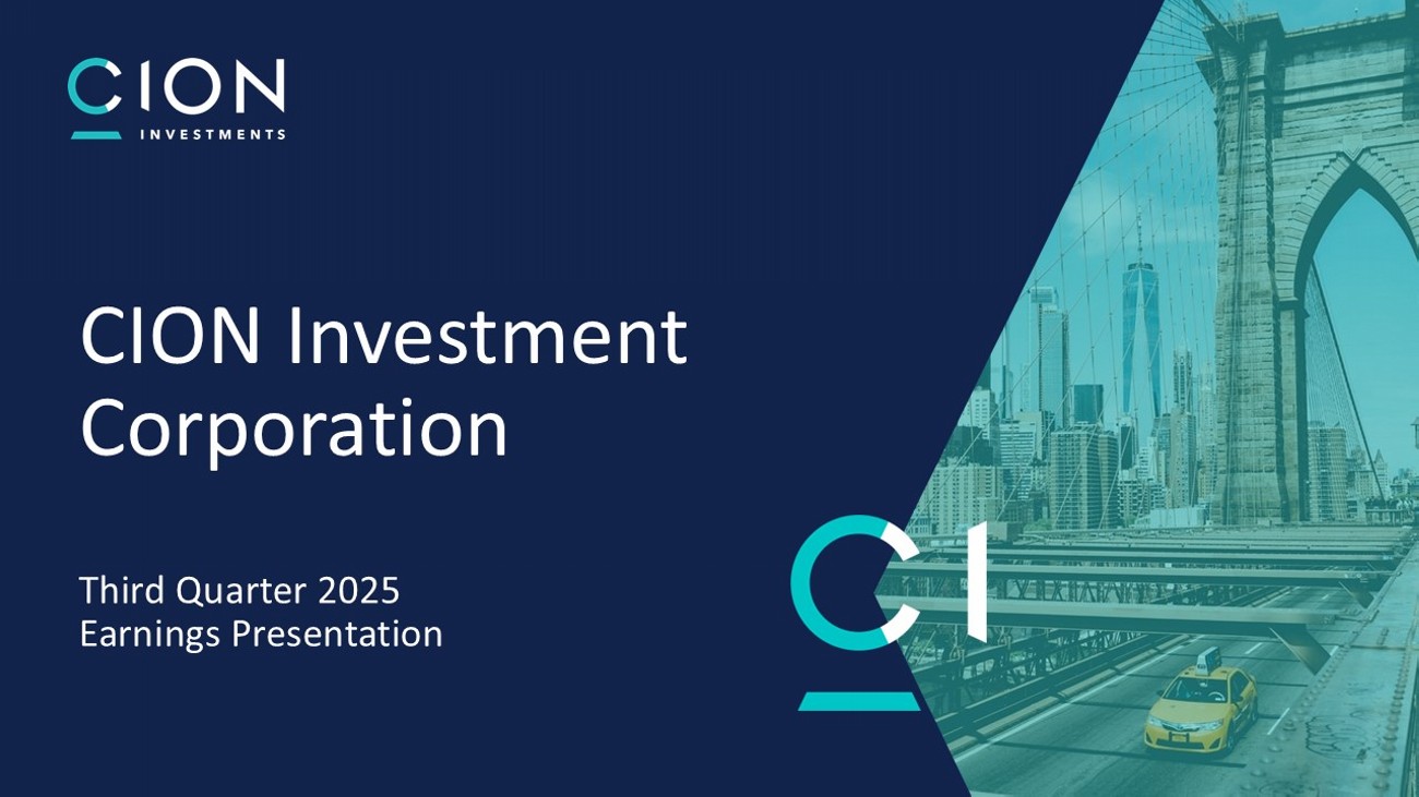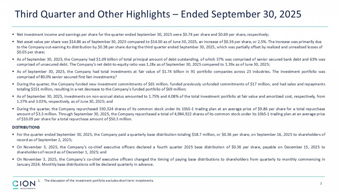 Disclosures and Forward - Looking Statements 2 The information contained in this earnings presentation should be viewed in conjunction with the earnings conference call of CION Investment Corporation (NYSE : CION) (“CION” or the “Company”) held on Thursday, November 6 , 2025 as well as the Company’s Quarterly Report on Form 10 - Q for the quarter ended September 30 , 2025 that was filed with the Securities and Exchange Commission (the “SEC”) on November 6 , 2025 . The information contained herein may not be used, reproduced or distributed to others, in whole or in part, for any other purpose without the prior written consent of the Company . This earnings presentation may contain forward - looking statements that involve substantial risks and uncertainties, including the impact of tariffs and trade disputes with other countries, changes in inflation, high interest rates and the risk of recession on the business, future operating results, access to capital and liquidity of the Company and its portfolio companies . You can identify these statements by the use of forward - looking terminology such as “may,” “will,” “should,” “expect,” “anticipate,” “project,” “target,” “estimate,” “intend,” “continue,” or “believe” or the negatives thereof or other variations thereon or comparable terminology, including references to assumptions, forecasts of future results, shareholder diversification, institutional research coverage and availability and access to capital . You should read statements that contain these words carefully because they discuss the Company’s plans, strategies, prospects and expectations concerning its business, operating results, financial condition and other similar matters . These statements represent the Company’s belief regarding future events that, by their nature, are uncertain and outside of the Company’s control, such as the price at which the Company’s shares of common stock will trade on the NYSE . Any forward - looking statement made by the Company in this earnings presentation speaks only as of the date on which the Company makes it . Factors or events that could cause the Company’s actual results to differ, possibly materially from its expectations, include, but are not limited to, the risks, uncertainties and other factors the Company identifies in the sections entitled “Risk Factors” and “Forward - Looking Statements” in filings the Company makes with the SEC, and it is not possible for the Company to predict or identify all of them . The Company undertakes no obligation to update or revise publicly any forward - looking statements, whether as a result of new information, future events or otherwise, except as required by law . This earnings presentation does not constitute a prospectus and should under no circumstances be understood as an offer to sell or the solicitation of an offer to buy the Company’s common stock or any other securities nor will there be any sale of common stock or any other securities referred to in this earnings presentation in any state or jurisdiction in which such offer, solicitation or sale would be unlawful prior to the registration or qualification under the securities laws of such state or jurisdiction . Nothing in these materials should be construed as a recommendation to invest in any securities that may be issued by the Company or as legal, accounting or tax advice . An investment in securities of the type described herein presents certain risks . The Company is managed by CION Investment Management, LLC, an affiliate of the Company . Nothing contained herein shall be relied upon as a promise or representation whether as to past or future performance . The information contained in this earnings presentation is summary information that is intended to be considered in the context of other public announcements that the Company may make, by press release or otherwise, from time to time . The Company undertakes no duty or obligation to publicly update or revise the information contained in this earnings presentation, except as required by law . These materials contain information about the Company, certain of its personnel and affiliates and its historical performance . You should not view information related to past performance of the Company as indicative of its future results, the achievement of which cannot be assured . Past performance does not guarantee future results, which may vary . The value of investments and the income derived from investments will fluctuate and can go down as well as up . A loss of principal may occur .