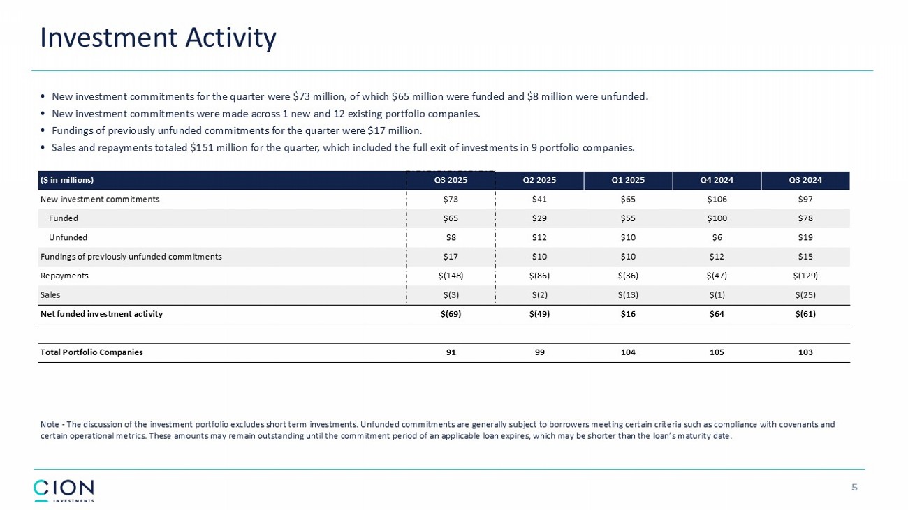 4 Selected Financial Highlights 1. The discussion of the investment portfolio excludes short term investments. 2. Total debt outstanding excludes netting of debt issuance costs. Please refer to page 10 for debt net of issuance costs. 3. Includes a special distribution of $ 0 . 05 per share during the quarter ended December 31 , 2024 . Q3 2024 Q4 2024 Q1 2025 Q2 2025 Q3 2025 ($ in millions) $1,753 $1,820 $1,792 $1,766 $1,738 Investment portfolio, at fair value (1) $1,070 $1,117 $1,117 $1,117 $1,092 Total debt outstanding (2) $839 $821 $757 $759 $773 Net assets 1.28x 1.36x 1.48x 1.47x 1.41x Debt - to - equity 1.18x 1.27x 1.39x 1.39x 1.28x Net debt - to - equity $59.6 $57.9 $56.1 $52.5 $78.7 Total investment income $21.6 $18.7 $19.3 $16.9 $38.6 Net investment income $(22.0) $(13.2) $(62.0) $10.4 $(2.7) Net realized and unrealized (losses) gains $(0.4) $5.5 $(42.7) $27.3 $35.9 Net increase (decrease) in net assets resulting from operations Per Share Data $15.73 $15.43 $14.28 $14.50 $14.86 Net asset value per share $0.40 $0.35 $0.36 $0.32 $0.74 Net investment income per share $(0.41) $(0.25) $(1.16) $0.20 $(0.05) Net realized and unrealized (losses) gains per share $(0.01) $0.10 $(0.80) $0.52 $0.69 Earnings per share $0.36 $0.41 $0.36 $0.36 $0.36 Distributions declared per share (3)