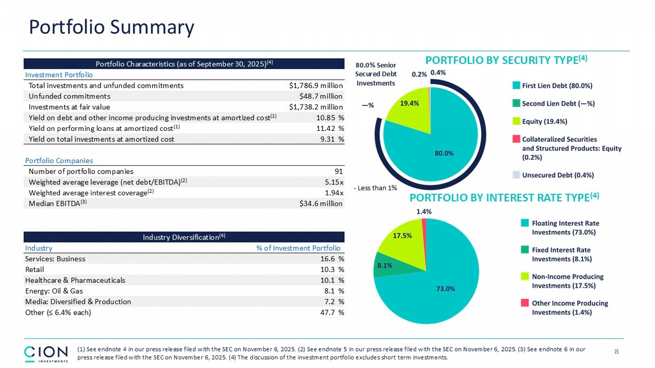 PORTFOLIO BY SECURITY TYPE (4) PORTFOLIO BY INTEREST RATE TYPE (4) Portfolio Summary 8 ( 1 ) See endnote 4 in our press release filed with the SEC on November 6 , 2025 . ( 2 ) See endnote 5 in our press release filed with the SEC on November 6 , 2025 . ( 3 ) See endnote 6 in our press release filed with the SEC on November 6 , 2025 . ( 4 ) The discussion of the investment portfolio excludes short term investments . Portfolio Characteristics (as of September 30, 2025) (4) Investment Portfolio $1,786.9 million Total investments and unfunded commitments $48.7 million Unfunded commitments $1,738.2 million Investments at fair value 10.85 % Yield on debt and other income producing investments at amortized cost (1) 11.42 % Yield on performing loans at amortized cost (1) 9.31 % Yield on total investments at amortized cost Portfolio Companies 91 Number of portfolio companies 5.15x Weighted average leverage (net debt/EBITDA) (2) 1.94x Weighted average interest coverage (2) $34.6 million Median EBITDA (3) Industry Diversification (4) % of Investment Portfolio Industry 16.6 % Services: Business 10.3 % Retail 10.1 % Healthcare & Pharmaceuticals 8.1 % Energy: Oil & Gas 7.2 % Media: Diversified & Production 47.7 % Other (≤ 6.4% each) 80.0% Senior Secured Debt Investments - Less than 1%