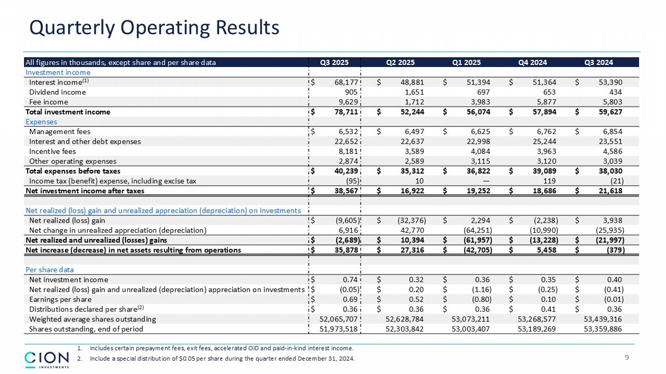 Quarterly Operating Results 9 Q3 2024 Q4 2024 Q1 2025 Q2 2025 Q3 2025 All figures in thousands, except share and per share data Investment income $ 53,390 $ 51,364 $ 51,394 $ 48,881 $ 68,177 Interest income (1) 434 653 697 1,651 905 Dividend income 5,803 5,877 3,983 1,712 9,629 Fee income $ 59,627 $ 57,894 $ 56,074 $ 52,244 $ 78,711 Total investment income Expenses $ 6,854 $ 6,762 $ 6,625 $ 6,497 $ 6,532 Management fees 23,551 25,244 22,998 22,637 22,652 Interest and other debt expenses 4,586 3,963 4,084 3,589 8,181 Incentive fees 3,039 3,120 3,115 2,589 2,874 Other operating expenses $ 38,030 $ 39,089 $ 36,822 $ 35,312 $ 40,239 Total expenses before taxes (21) 119 — 10 (95) Income tax (benefit) expense, including excise tax $ 21,618 $ 18,686 $ 19,252 $ 16,922 $ 38,567 Net investment income after taxes Net realized (loss) gain and unrealized appreciation (depreciation) on investments $ 3,938 $ (2,238) $ 2,294 $ (32,376) $ (9,605) Net realized (loss) gain (25,935) (10,990) (64,251) 42,770 6,916 Net change in unrealized appreciation (depreciation) $ (21,997) $ (13,228) $ (61,957) $ 10,394 $ (2,689) Net realized and unrealized (losses) gains $ (379) $ 5,458 $ (42,705) $ 27,316 $ 35,878 Net increase (decrease) in net assets resulting from operations Per share data $ 0.40 $ 0.35 $ 0.36 $ 0.32 $ 0.74 Net investment income $ (0.41) $ (0.25) $ (1.16) $ 0.20 $ (0.05) Net realized (loss) gain and unrealized (depreciation) appreciation on investments $ (0.01) $ 0.10 $ (0.80) $ 0.52 $ 0.69 Earnings per share $ 0.36 $ 0.41 $ 0.36 $ 0.36 $ 0.36 Distributions declared per share (2) 53,439,316 53,268,577 53,073,211 52,628,784 52,065,707 Weighted average shares outstanding 53,359,886 53,189,269 53,003,407 52,303,842 51,973,518 Shares outstanding, end of period 1. Includes certain prepayment fees, exit fees, accelerated OID and paid - in - kind interest income. 2. Include a special distribution of $0.05 per share during the quarter ended December 31, 2024.