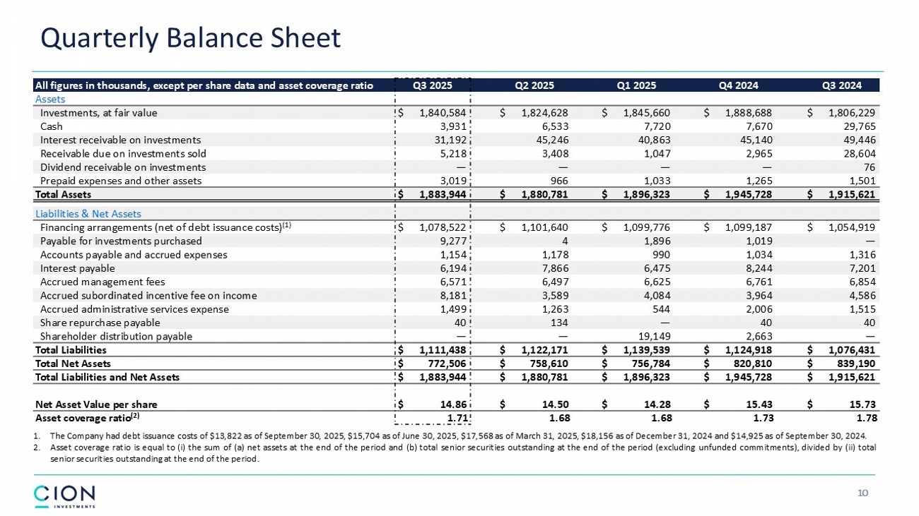 Quarterly Balance Sheet 10 Q3 2024 Q4 2024 Q1 2025 Q2 2025 Q3 2025 All figures in thousands, except per share data and asset coverage ratio Assets $ 1,806,229 $ 1,888,688 $ 1,845,660 $ 1,824,628 $ 1,840,584 Investments, at fair value 29,765 7,670 7,720 6,533 3,931 Cash 49,446 45,140 40,863 45,246 31,192 Interest receivable on investments 28,604 2,965 1,047 3,408 5,218 Receivable due on investments sold 76 — — — — Dividend receivable on investments 1,501 1,265 1,033 966 3,019 Prepaid expenses and other assets $ 1,915,621 $ 1,945,728 $ 1,896,323 $ 1,880,781 $ 1,883,944 Total Assets Liabilities & Net Assets $ 1,054,919 $ 1,099,187 $ 1,099,776 $ 1,101,640 $ 1,078,522 Financing arrangements (net of debt issuance costs) (1) — 1,019 1,896 4 9,277 Payable for investments purchased 1,316 1,034 990 1,178 1,154 Accounts payable and accrued expenses 7,201 8,244 6,475 7,866 6,194 Interest payable 6,854 6,761 6,625 6,497 6,571 Accrued management fees 4,586 3,964 4,084 3,589 8,181 Accrued subordinated incentive fee on income 1,515 2,006 544 1,263 1,499 Accrued administrative services expense 40 40 — 134 40 Share repurchase payable — 2,663 19,149 — — Shareholder distribution payable $ 1,076,431 $ 1,124,918 $ 1,139,539 $ 1,122,171 $ 1,111,438 Total Liabilities $ 839,190 $ 820,810 $ 756,784 $ 758,610 $ 772,506 Total Net Assets $ 1,915,621 $ 1,945,728 $ 1,896,323 $ 1,880,781 $ 1,883,944 Total Liabilities and Net Assets $ 15.73 $ 15.43 $ 14.28 $ 14.50 $ 14.86 Net Asset Value per share 1.78 1.73 1.68 1.68 1.71 Asset coverage ratio (2) 1. The Company had debt issuance costs of $ 13 , 822 as of September 30 , 2025 , $ 15 , 704 as of June 30 , 2025 , $ 17 , 568 as of March 31 , 2025 , $ 18 , 156 as of December 31 , 2024 and $ 14 , 925 as of September 30 , 2024 . 2. Asset coverage ratio is equal to (i) the sum of (a) net assets at the end of the period and (b) total senior securities outstanding at the end of the period (excluding unfunded commitments), divided by (ii) total senior securities outstanding at the end of the period .