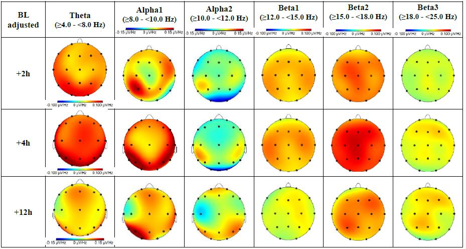 Figure 1. Topographic plot of oscillatory* spectral power change from baseline (pre-dose).
