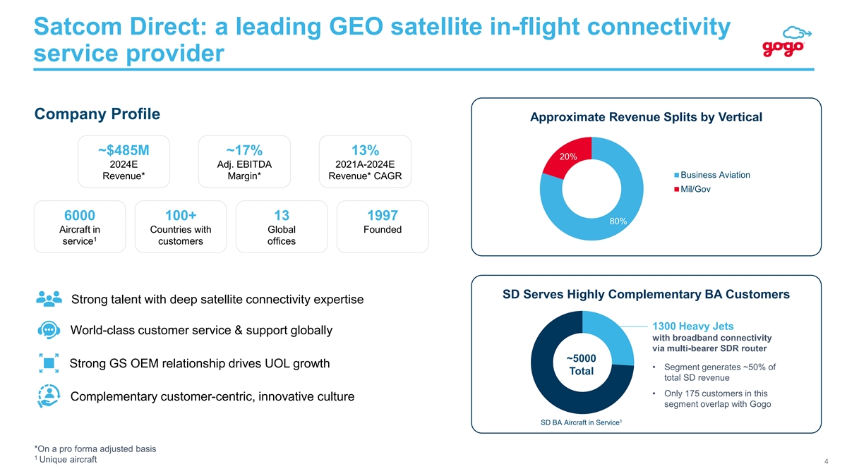 Establishing the only multi-orbit, multi-band global IFC provider for the BA and military/government mobility markets Unique LEO, GEO, L-band, ATG and Flight Deck offering able to satisfy performance, resiliency and cost needs of all BA segments Combines two respected business aviation-focused companies Expands platform for the sale and service of new products across combined installed base of 12,000 unique global customers Accelerates adoption of Gogo’s LEO connectivity solution with Satcom Direct’s global sales and support network Complementary OEM and aftermarket positions to drive enhanced recurring revenue with long customer lifetimes Provides Gogo entry into the large and fast-growing military/government mobility vertical Brings together world-class talent with complementary expertise Delivers scale benefits, immediate accretion and significant cost synergies Enhances Gogo’s strategic, competitive and financial positions for greater long-term shareholder and customer value creation 3
